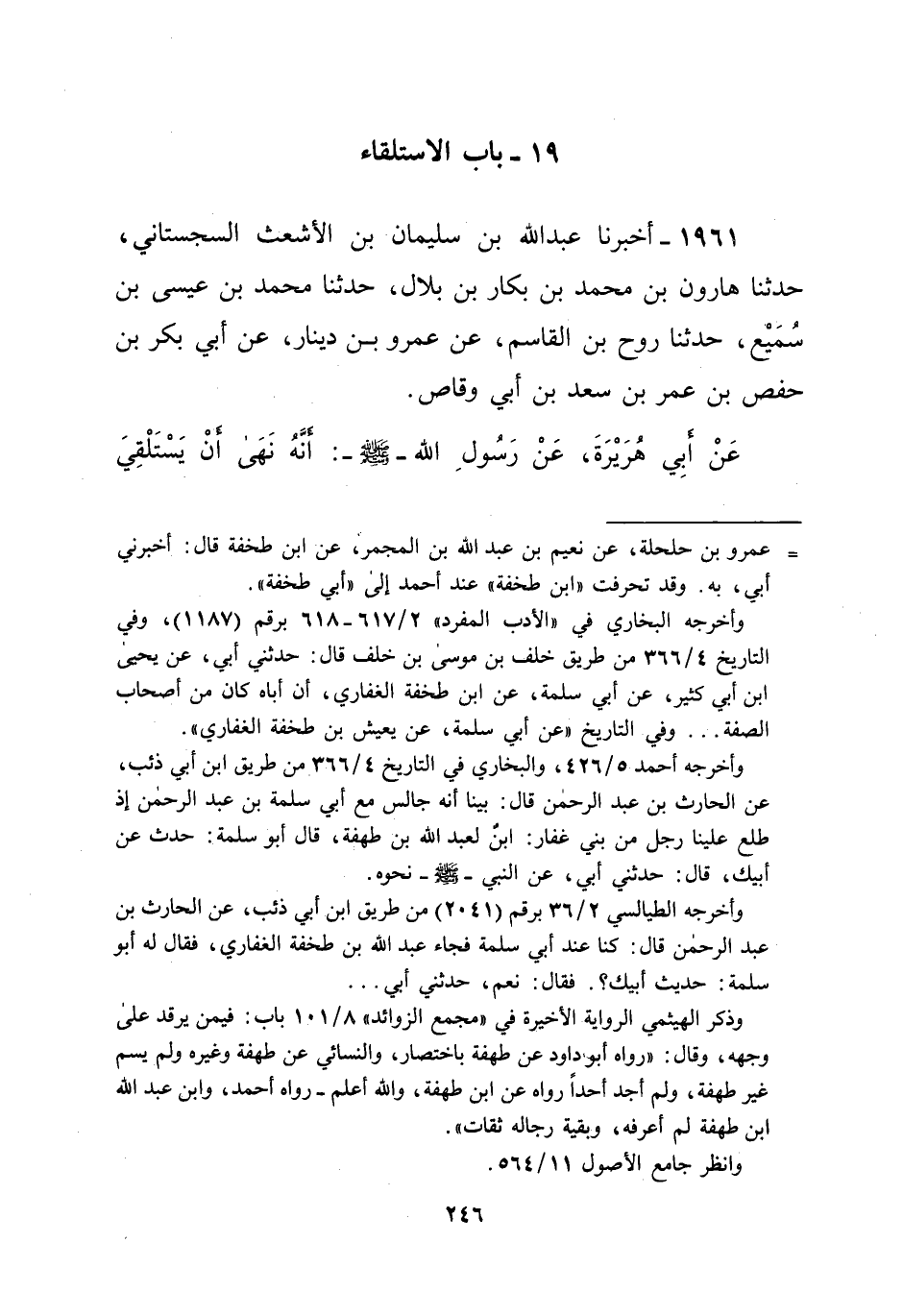 1961 - أخبرنا عبد الله بن سليمان بن الأشعث السجستاني، حدثنا هارون بن محمد بن بكار بن بلال، حدثنا محمد بن عيسى بن سُمَيْع، حدثنا روح بن القاسم، عن عمرو بن دينار، عن أبي بكر بن حفص بن عمر بن سعد بن أبي وقاص. عَنْ أَبِي هُرَيْرَةَ، عَنْ رَسُولِ الله -صلى الله عليه وسلم-: أنَّهُ نَهَى أنْ يَسْتَلْقِيَ