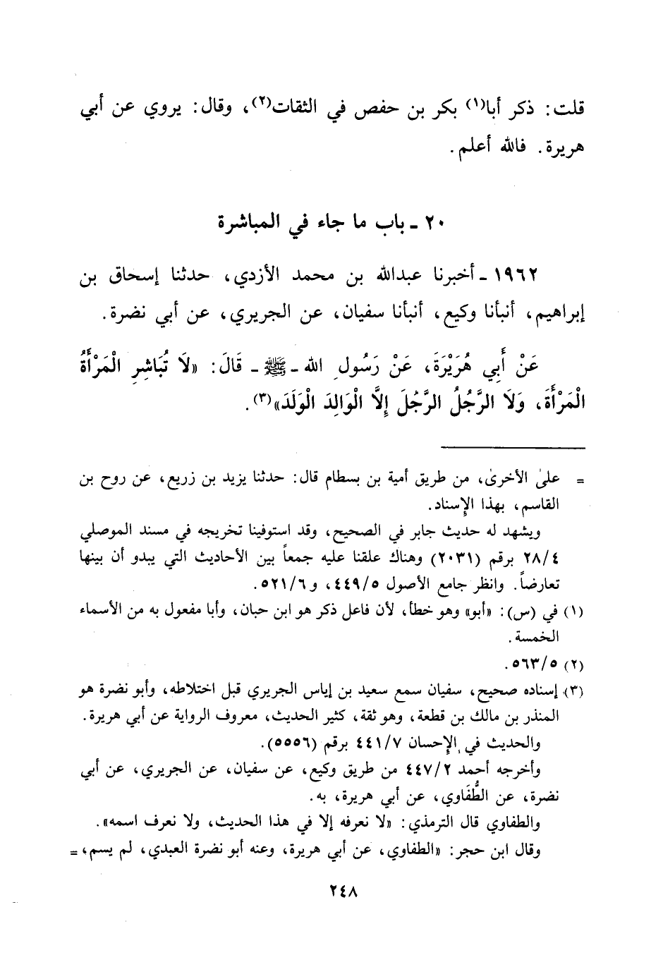 1962 - أخبرنا عبد الله بن محمد الأزدي، حدثنا إسحاق بن إبراهيم، أنبأنا وكيع، أنبأنا سفيان، عن الجريري، عن أبي نضرة. عَنْ أبِي هُرَيْرَةَ، عَنْ رَسُولِ الله -صلى الله عليه وسلم- قَالَ: "لا تُبَاشِرِ الْمَرْاةُ الْمَرْأةَ، وَلاَ الرَّجُلُ الرَّجُلَ إلاَّ الْوَالِدَ الْوَلَدَ" (¬3).