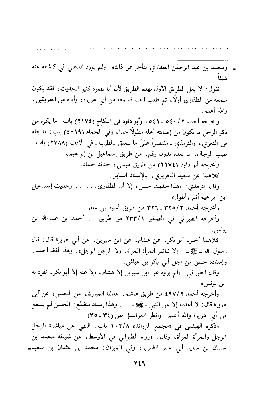 = ومحمد بن عبد الرحمن الطفاوي متأخر عن ذاك". ولم يورد الذهبي في كاشفه عنه شيئاً. نقول: لا يعل الطريق الأول بهذه الطريق لأن أبا نضرة كثير الحديث، فقد يكون سمعه من الطفاوي أولاً، ثم طلب العلو فسمعه من أبي هريرة، وأداه من الطريقين، والله أعلم.
