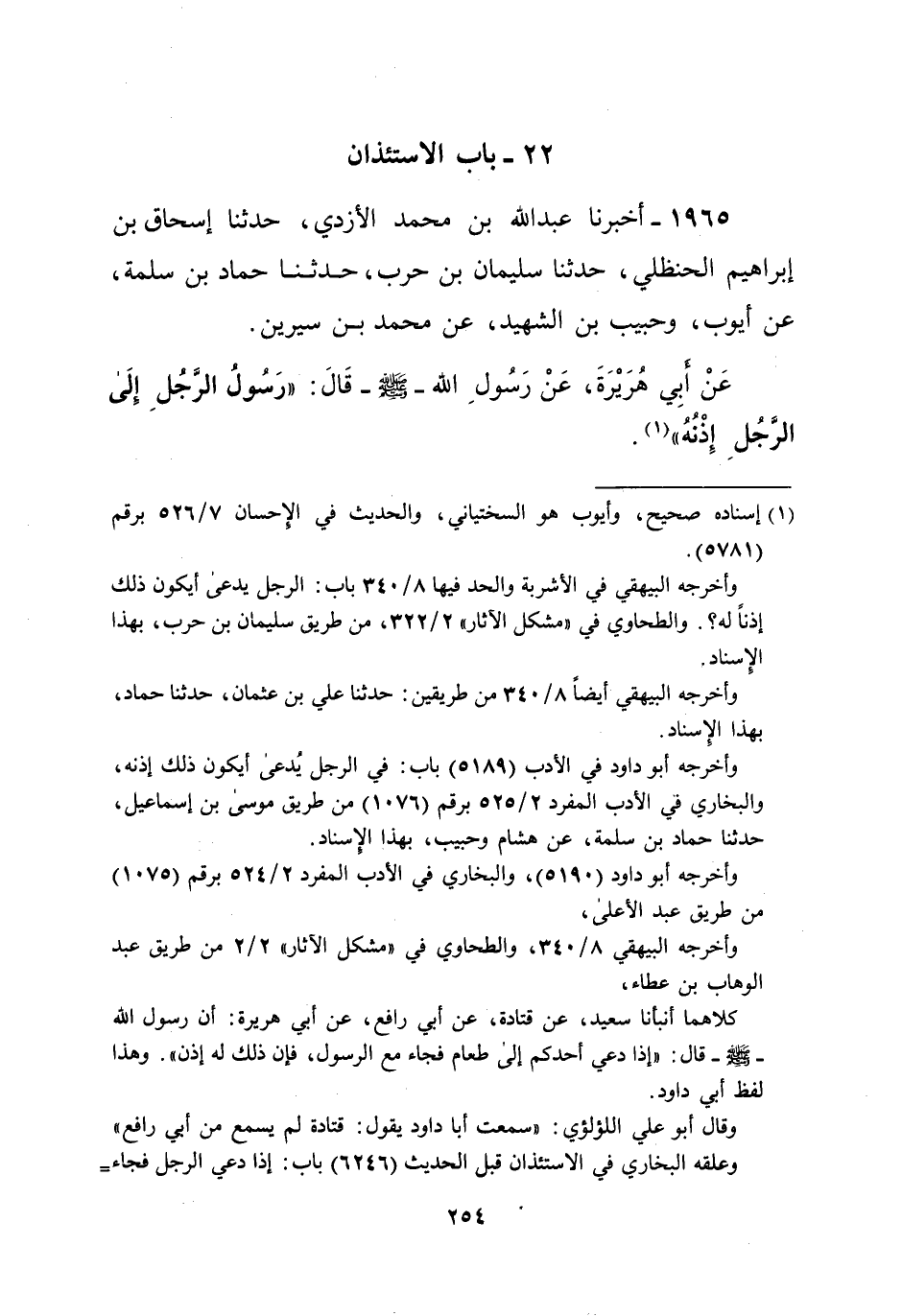 1965 - أخبرنا عبد الله بن محمد الأزدي، حدثنا إسحاق بن إبراهيم الحنظلي، حدثنا سليمان بن حرب، حدثنا حماد بن سلمة، عن أيوب، وحبيب بن الشهيد، عن محمد بن سيرين. عَنْ أبِي هُرَيْرَةَ، عَنْ رسول الله -صلى الله عليه وسلم- قَالَ: "رَسُولُ الرَّجُلِ إلَى الرَّجُلَ إِذْنُهُ" (¬1).