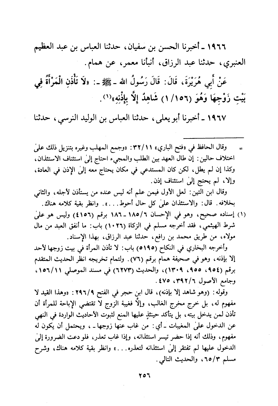 1966 - أخبرنا الحسن بن سفيان، حدثنا العباس بن عبد العظيم العنبري، حدثنا عبد الرزاق، أنبأنا معمر، عن همام. عَنْ أبِي هُرَيْرَةَ، قَالَ: قَالَ رَسُولُ الله -صلى الله عليه وسلم-: "لا تَأْذَنِ الْمَرْأةُ في بَيْتِ زَوْجِهَا وَهُوَ (156/ 1) شَاهِدٌ إِلاَّ بِإِذْنِهِ" (¬1).