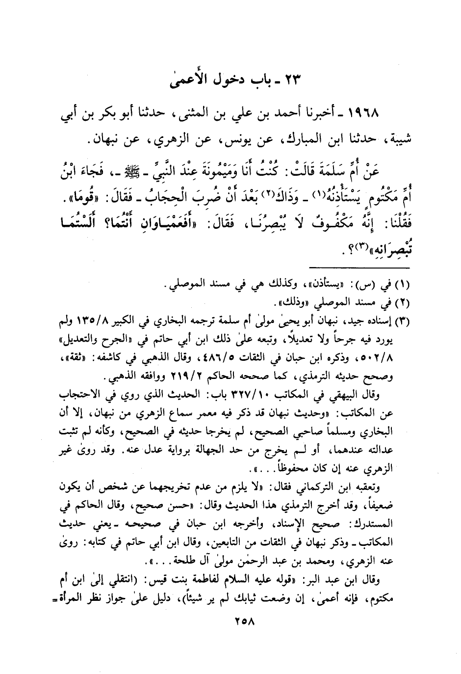 1968 - أخبرنا أحمد بن علي بن المثنى، حدثنا أبو بكر بن أبي شيبة، حدثنا ابن المبارك، عن يونس، عن الزهري، عن نبهان. عَنْ أُمِّ سَلَمَةَ قَالَتْ: كُنْتُ أَنَا وَمَيْمُونَةَ عِنْدَ النَّبِيِّ -صلى الله عليه وسلم-، فَجَاءَ ابْنُ أُمِّ مَكْتُومٍ يَسْتَأذِنُهُ (¬1) - وَذَاكَ (¬2) بَعْدَ أنْ ضُرِبَ الْحِجَابُ- فَقَالَ: "قُومَا". فَقُلْنَا: إِنَّهُ مَكْفُوفٌ لا يُبْصِرُنَا، فَقَالَ: "أفَعَمْيَاوَانِ أَنْتُمَا؟ ألَسْتُمَا تُبْصِرَانِهِ" (¬3)؟.