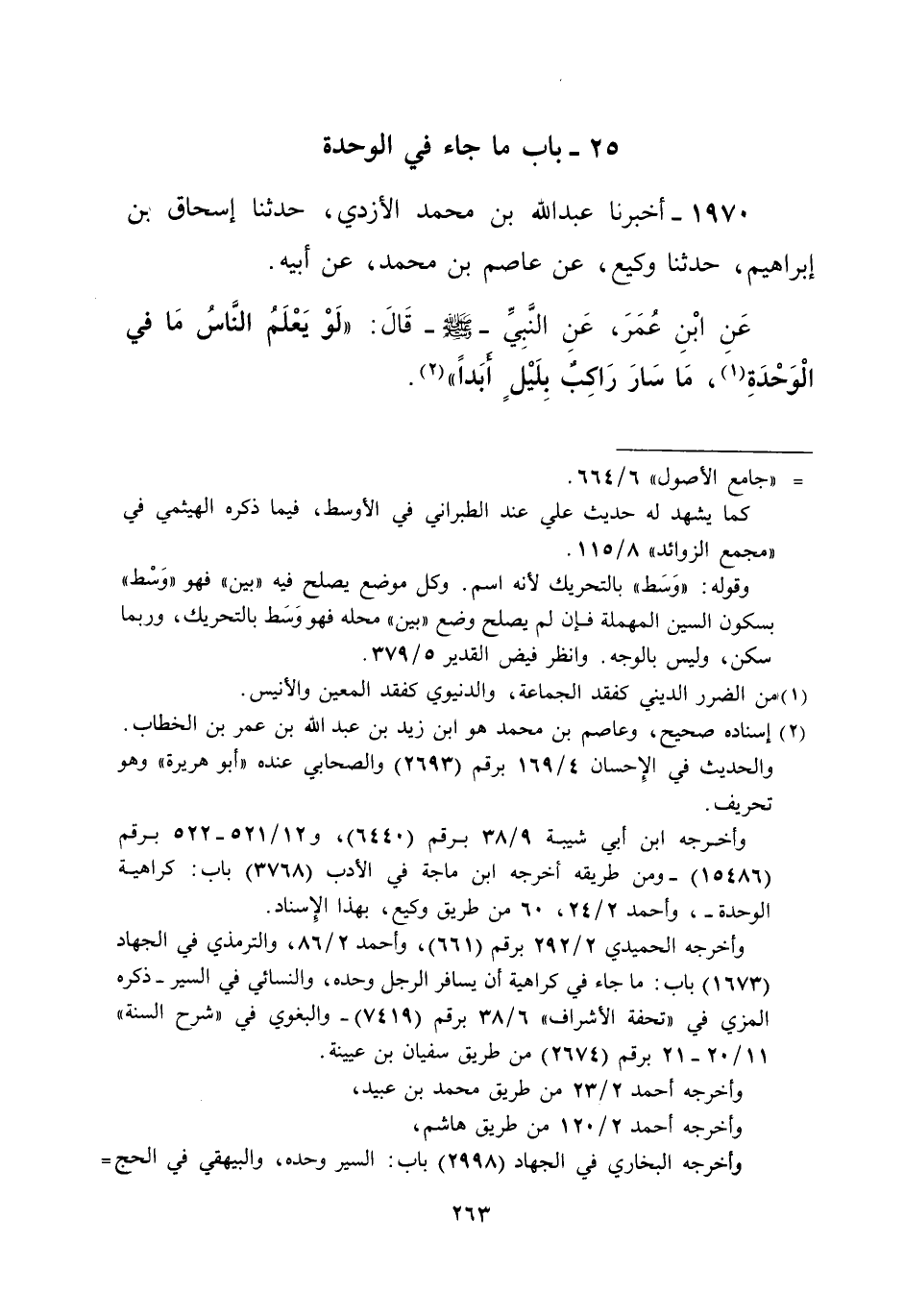 1970 - أخبرنا عبد الله بن محمد الأزدي، حدثنا إسحاق ابن إبراهيم، حدثنا وكيع، عن عاصم بن محمد، عن أبيه. عَنِ ابْنِ عُمَرَ، عَنِ النَّبِيِّ -صلى الله عليه وسلم- قَالَ: "لَوْ يَعْلَمُ النَّاسُ مَا في الْوَحْدَةِ (¬1)، مَا سَارَ رَاكبٌ بِلَيْلٍ أبَداً" (¬2).