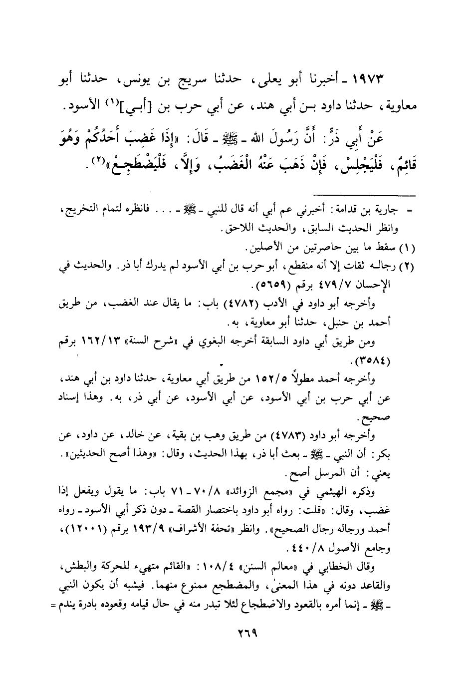1973 - أخبرنا أبو يعلى، حدثنا سريج بن يونس، حدثنا أبو معاوية، حدثنا داود بن أبي هند، عن أبي حرب بن [أبي] (¬1) الأسود. عَنْ أبِي ذَرٍّ: أنَّ رسول الله -صلى الله عليه وسلم- قَالَ: "إِذَا غَضِبَ أَحَدُكُمْ وَهُوَ قَائِمٌ، فَلْيَجْلِسْ، فَإِنْ ذَهَبَ عَنْهُ الْغَضَبُ، وَإِلا، فَلْيَضْطَجِعْ" (¬2).