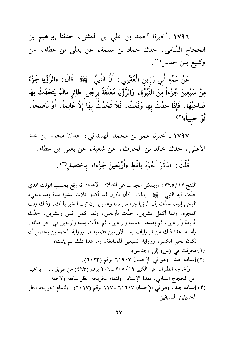 1796 - أخبرنا أحمد بن علي بن المثنى، حدثنا إبراهيم بن الحجاج السَّامي، حدثنا حماد بن سلمة، عن يعلى بن عطاء، عن وكيع بن حدس (¬1). عَنْ عمه أبِي رَزِينٍ الْعُقَيْلِي: أَنَّ النَّبِيَّ -صلى الله عليه وسلم- قَالَ: "الرُّؤْيَا جُزْءٌ مِنْ سَبْعِينَ جُزْءاً مِنَ النُّبُوَّةِ، وَالرُّؤْيَا مُعَلَّقَةٌ بِرِجْلِ طَائِرٍ مَالَمْ يتحدث بِهَا صَاحِبُهَا، فَإِذَا حَدَّثَ بِهَا وَقَعَتْ، فَلا تُحَدِّثْ بِهَا إِلا عَالِماً، أوْ نَاصِحاً، أوْ حَبِيباً" (¬2).