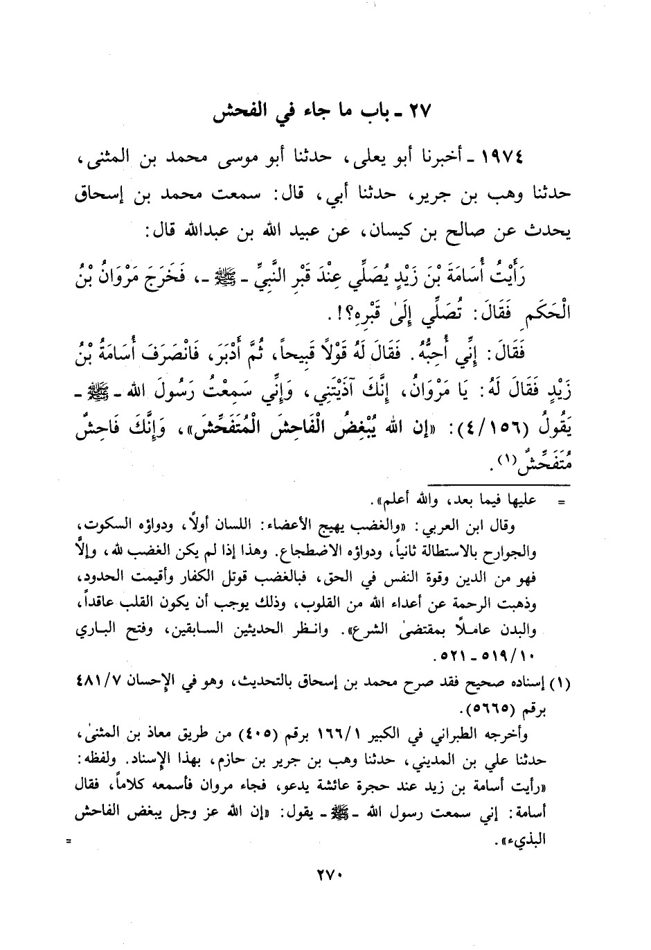 1974 - أخبرنا أبو يعلى، حدثنا أبو موسى محمد بن المثنى، حدثنا وهب بن جرير، حدثنا أبي، قال: سمعت محمد بن إسحاق يحدث عن صالح بن كيسان، عن عبيد الله بن عبد الله قال: رَأَيْتُ أُسَامَةَ بْنَ زَيْدٍ يُصَلِّي عِنْدَ قَبْرِ النَّبِيِّ -صلى الله عليه وسلم-، فَخَرَجَ مَرْوَانُ بْنُ الْحَكَمِ فَقَالَ: تُصَلِّي إِلَى قَبْرِهِ؟!. فَقَالَ: إِنِّي أُحِبُّهُ. فَقَالَ لَهُ قَوْلاً قَبِيحاً، ثُمَّ أَدْبَرَ، فَانْصَرَفَ أُسَامَةُ بْنُ زَيْدٍ فَقَالَ لَهُ: يَا مَرْوَانُ، إِنَّك آذَيْتَنِي، وَإِنِّي سَمِعْتُ رسول الله -صلى الله عليه وسلم- يَقُولُ (156/ 1): "إن الله يُبْغِضُ الْفَاحِشَ الْمُتَفَحِّشَ"، وَإِنَّكَ فَاحِشٌ مُتَفَحِّشٌ (¬1).