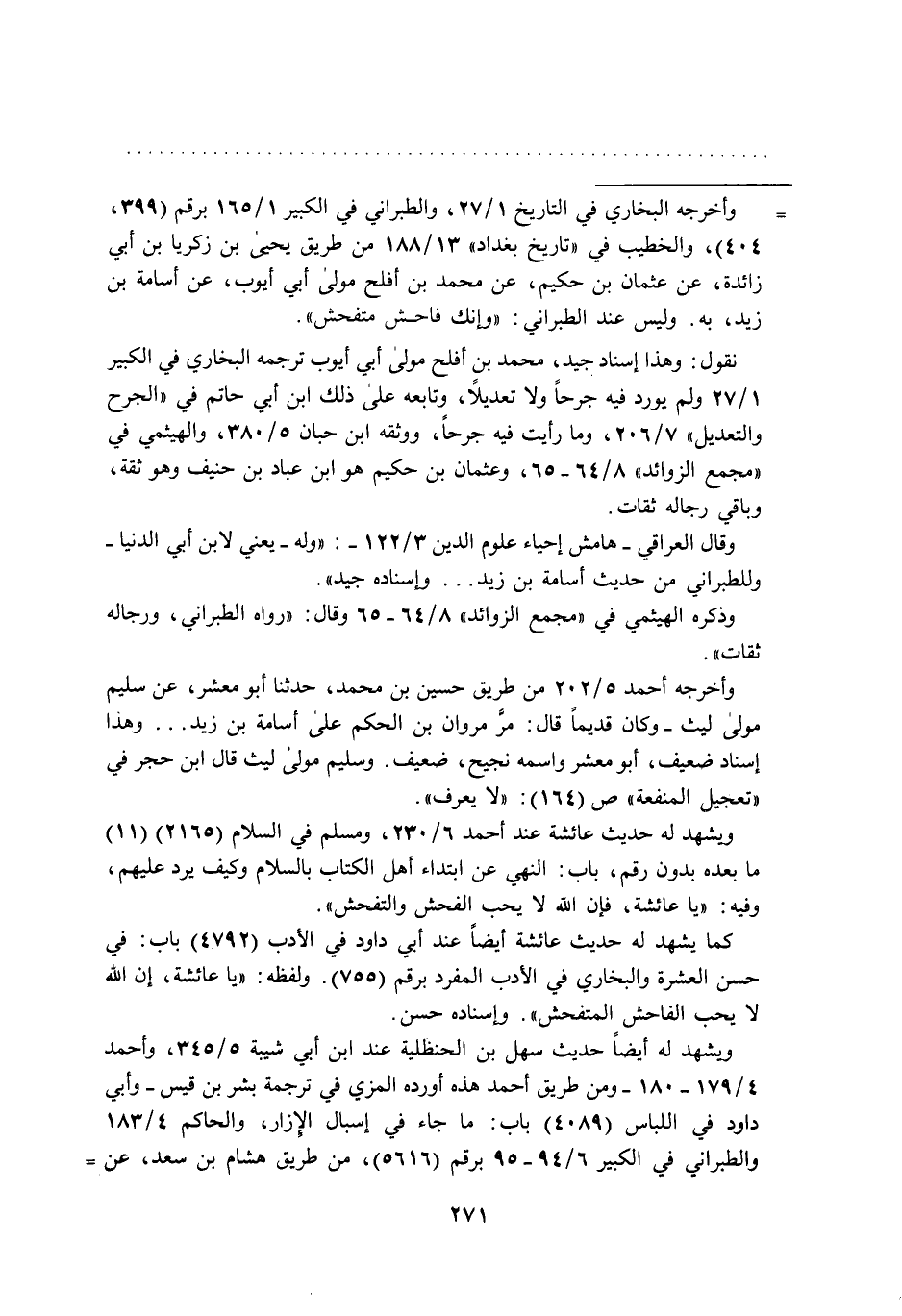 = وأخرجه البخاري في التاريخ 1/ 27، والطبراني في الكبير 1/ 165 برقم (399، 404)، والخطيب في "تاريخ بغداد" 13/ 188 من طريق يحيى بن زكريا بن أبي زائدة، عن عثمان بن حكيم، عن محمد بن أفلح مولى أبي أيوب، عن أسامة بن زيد، به. وليس عند الطبراني: "وإنك فاحش متفحش".