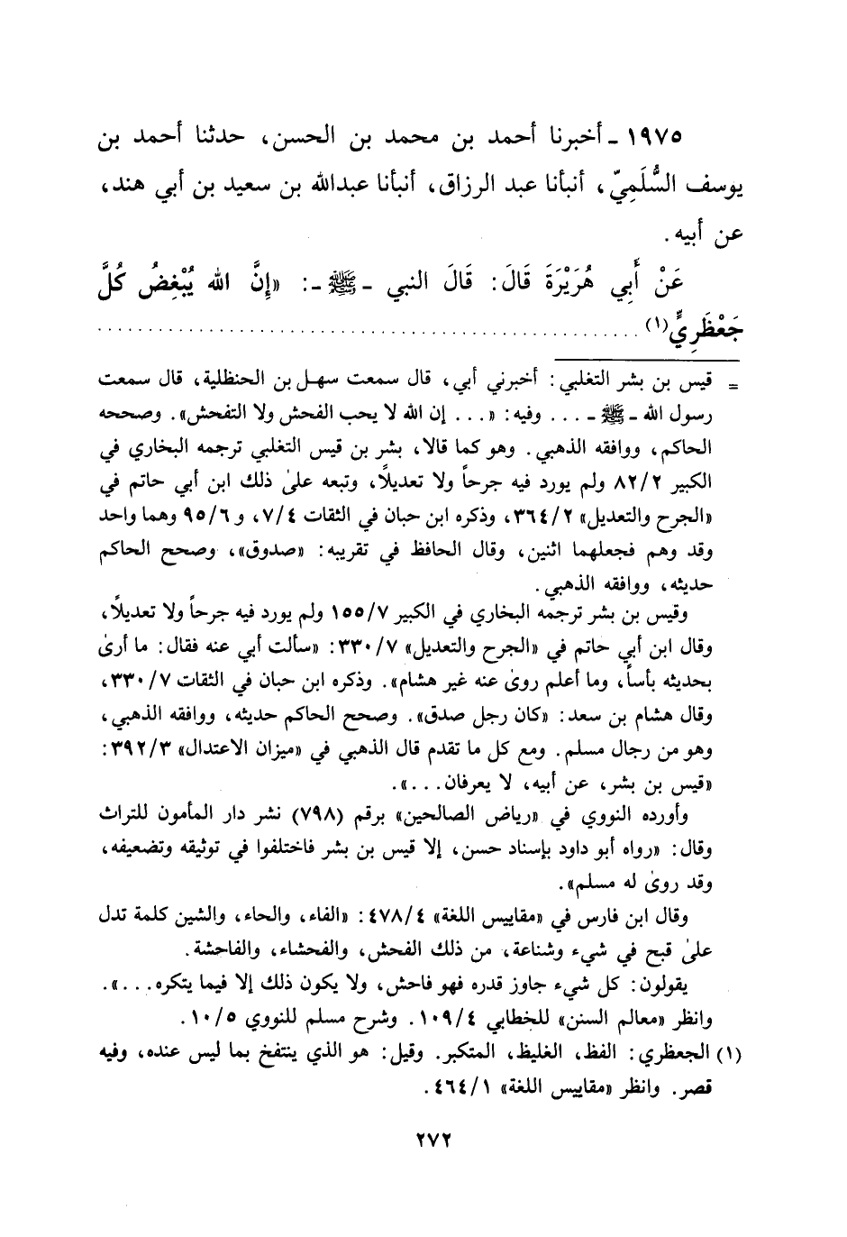 1975 - أخبرنا أحمد بن محمد بن الحسن، حدثنا أحمد بن يوسف السُّلَمِيّ، أنبأنا عبد الرزاق، أنبأنا عبد الله بن سعيد بن أبي هند، عن أبيه. عَنْ أبِي هُرَيْرَةَ قَالَ: قَالَ النبي -صلى الله عليه وسلم-: "إِنَّ الله يُبْغِضُ كُلَّ جَعْظَرِيٍّ (¬1). . . . . . . . . . . . . . . .