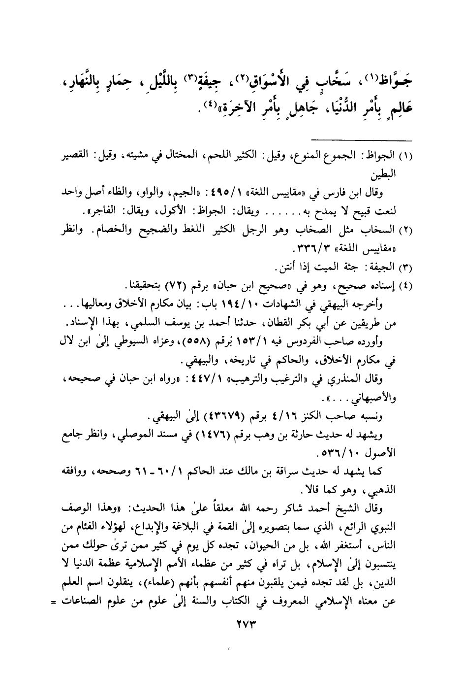 (¬1) الجواظ: الجموع المنوع، وقيل: الكثير اللحم، المختال في مشيته بن وقيل: القصير البطين وقال ابن فارس في "مقاييس اللغة" 1/ 495: "الجيم، والواو، والظاء أجل واحد لنعت قبيح لا يمدح به ...... ويقال: الجواظ: الأكول، ويقال: الفاجر".