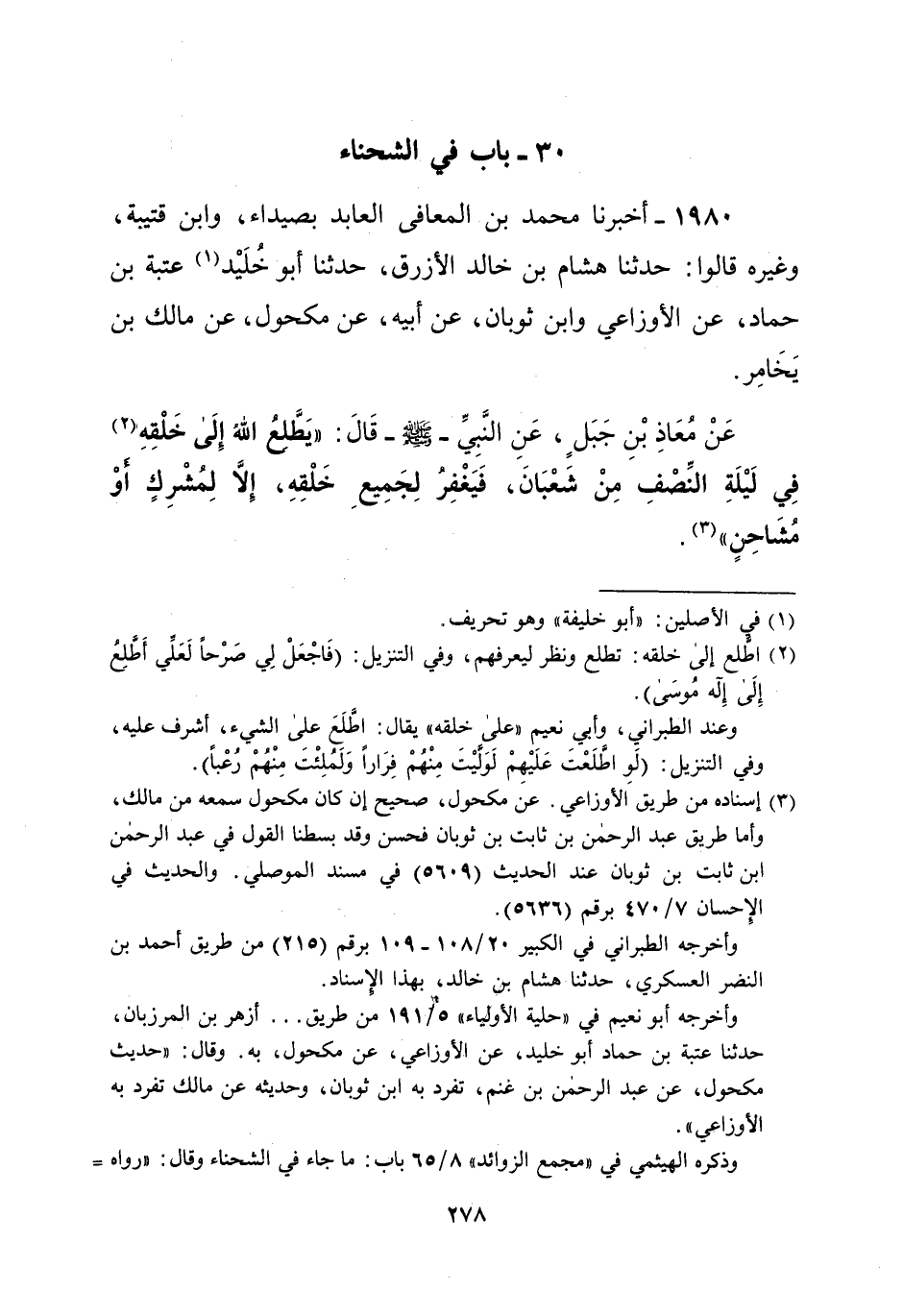 عَنْ مُعَاذِ بْنِ جَبَلٍ، عَنِ النَّبِيِّ -صلى الله عليه وسلم- قَالَ: "يَطَّلعُ اللهُ إِلَى خَلْقِهِ (¬2) فِي لَيْلَةِ النِّصْفِ مِنْ شَعْبَانَ، فَيَغْفِرُ لِجَمِيعِ خَلْقِهِ، الله لِمُشْرِكٍ أوْ مُشَاحِنٍ" (¬3).