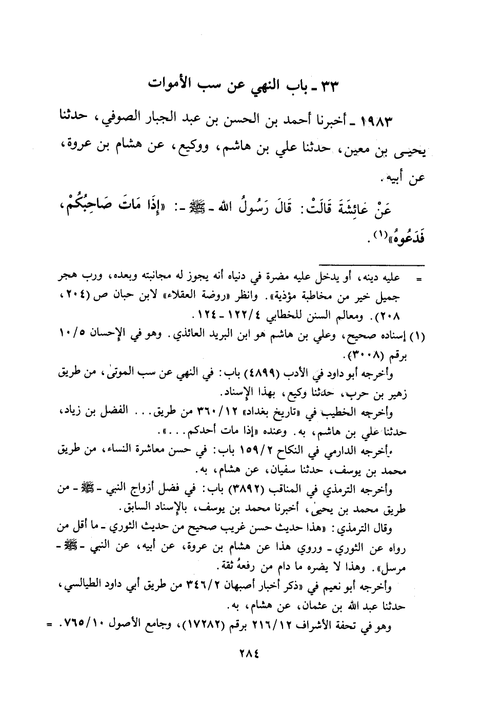 983؟ - أخبرنا أحمد بن الحسن بن عبد الجبار الصوفي، حدثنا يحيى بن معين، حدثنا علي بن هاشم، ووكيع، عن هشام بن عروة، عن أبيه.