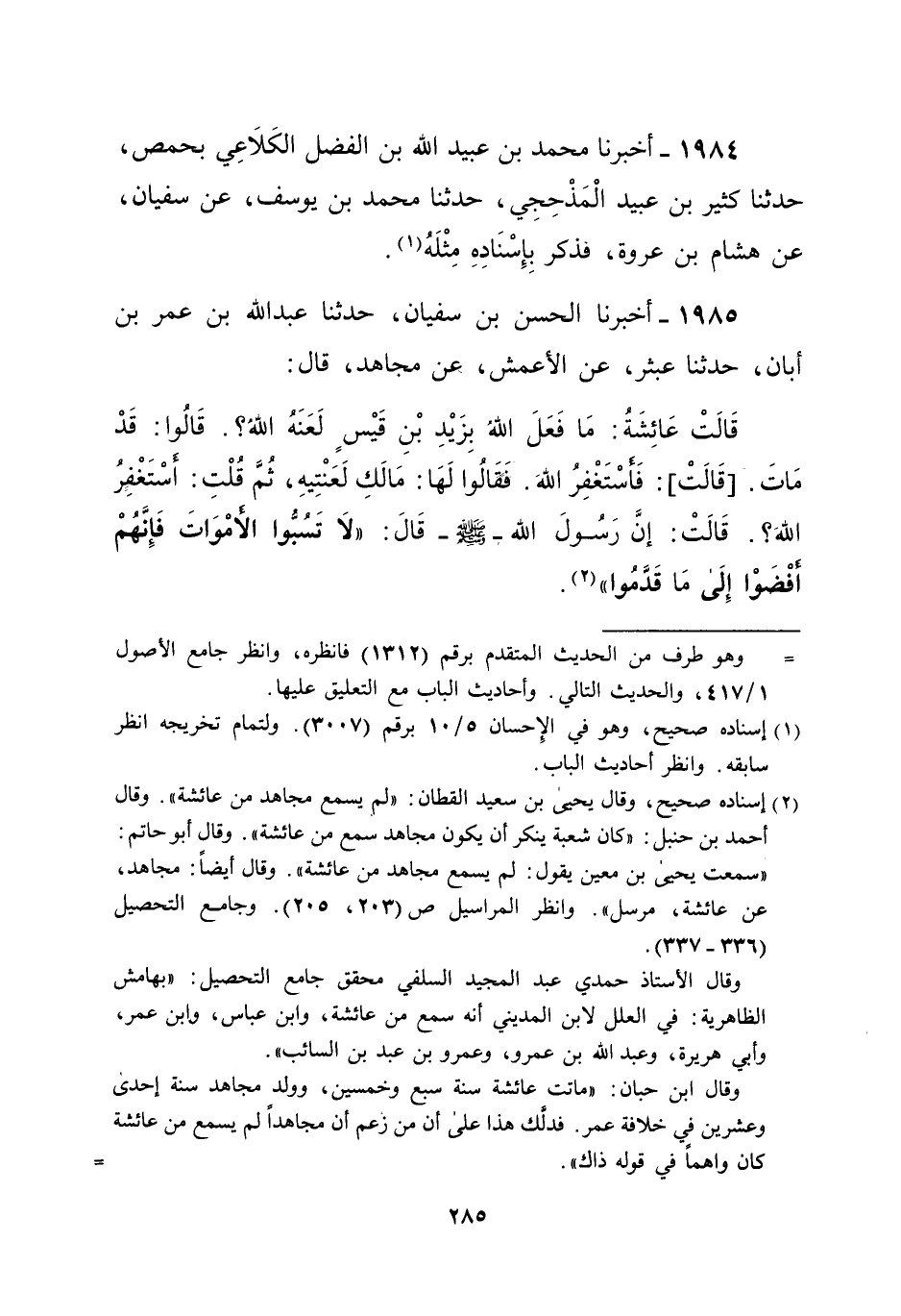 1985 - أخبرنا الحسن بن سفيان، حدثنا عبد الله بن عمر بن أبان، حدثنا عبثر، عن الأعمش، عن مجاهد، قال: