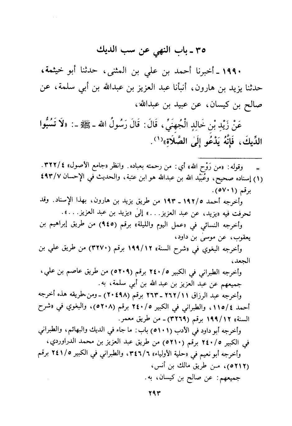 عَنْ زَيْدِ بْنِ خَالِدٍ الْجُهِنَيِّ، قَالَ: قَالَ رَسُولُ الله -صلى الله عليه وسلم-: "لا تَسُبُّوا الدِّيكَ، فَإِنَّهُ يَدْعُو إِلَى الصَّلاةِ" (¬1).