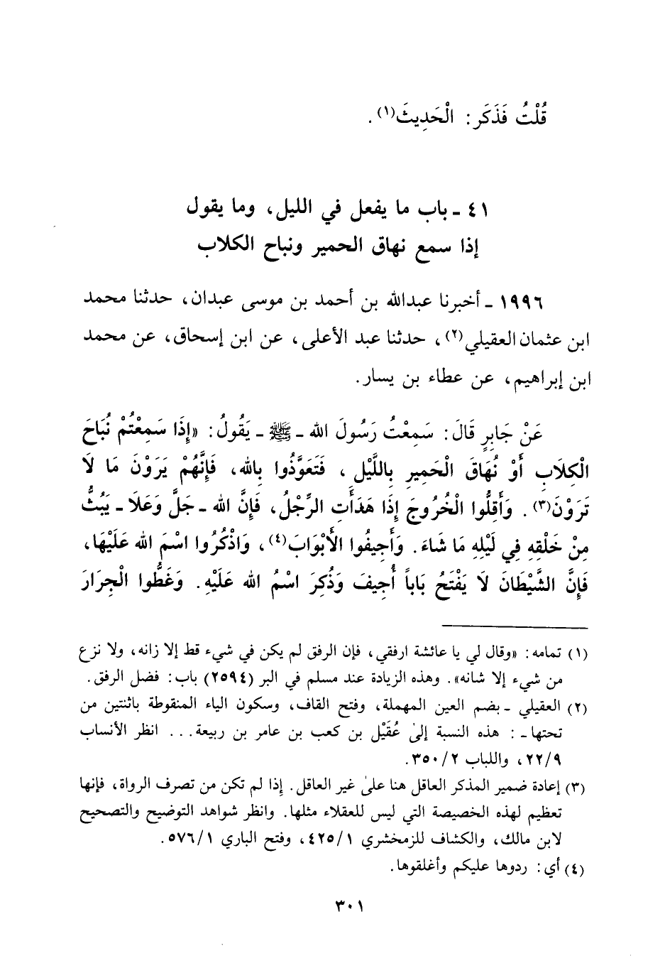 1996 - أخبرنا عبد الله بن أحمد بن موسى عبدان، حدثنا محمد ابن عثمان العقيلي (¬2)، حدثنا عبد الأعلى، عن ابن إسحاق، عن محمد ابن إبراهيم، عن عطاء بن يسار. عَنْ جَابِرٍ قَالَ: سَمِعْتُ رَسُولَ الله -صلى الله عليه وسلم- يَقُولُ: "إِذَا سَمِعْتُمْ نُبَاحَ الْكِلاَب أوْ نُهَاقَ الْحَمِيرِ بِاللَّيْل، فَتَعَوَّذُوا بِالله، فَإِنَّهُمْ يَرَوْنَ مَا لا تَرَوْنَ (¬3). وَأقِلُّوا الْخُرُوجَ إِذَا هَدَأَتِ الرِّجْلُ، فَإِنَّ الله -جَلَّ وَعَلا- يَبُثُّ مِنْ خَلْقِهِ فِي لَيْلِهِ مَا شَاءَ. وَأجِيفُوا الأبْوَابَ (¬4)، وَاذْكرُوا اسْمَ الله عَلَيْهَا، فَإِنَّ الشَّيْطَانَ لا يَفْتَحُ بَاباً أُجِيفَ وَذُكِرَ اسْمُ الله عَلَيْهِ. وَغَطُّوا الجِرَارَ