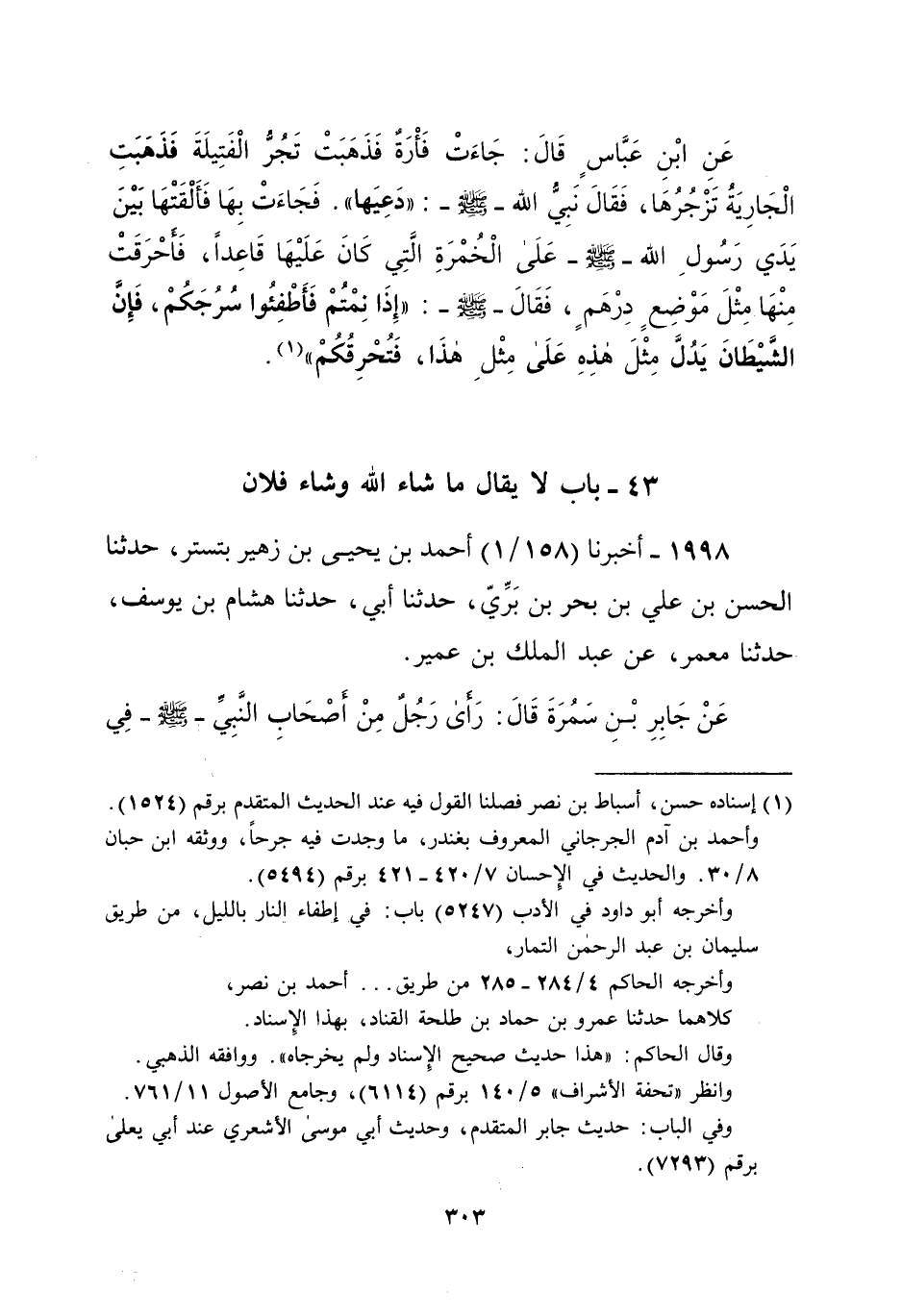 عَنِ ابْنِ عَبَّاسٍ قَالَ: جَاءَتْ فَأْرَةٌ فَذَهَبَتْ تَجُرُّ الْفَتِيلَةَ فَذَهَبَتِ الْجَارِيَةُ تَزْجُرُهَا، فَقَالَ نَبِيُّ الله -صلى الله عليه وسلم-: "دَعِيَها". فَجَاءَتْ بِهَا فَأَلقَتْهَا بيْنَ يَدَي رَسُولِ الله -صلى الله عليه وسلم- عَلَى الْخُمْرَةِ التِي كَانَ عَلَيْهَا قَاعِداً، فَاحْرَقَتْ مِنْهَا مِثْلَ مَوْضِعٍ دِرْهَمٍ، فَقَالَ -صلى الله عليه وسلم-: "إِذَا نِمْتُمْ فَأَطْفِئُوا سُرُجَكُمْ، فَإِن الشَيْطَانَ يَدُلَّ مِثْلَ هذِهِ عَلَى مِثْلِ هذَا، فَتُحْرِقُكُمْ" (¬1).