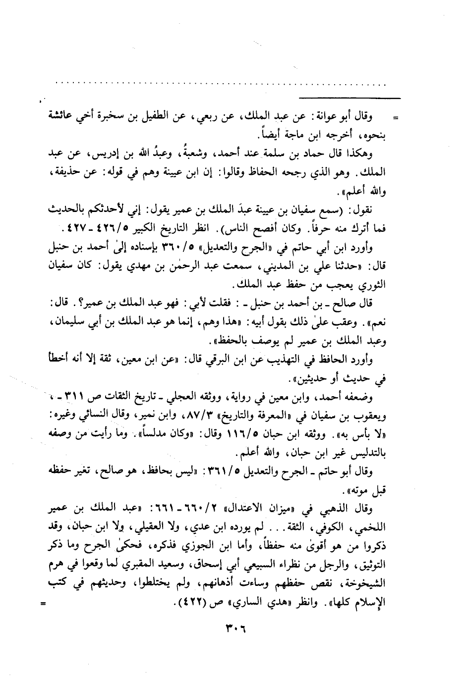 نقول: (سمع سفيان بن عيينة عبدَ الملك بن عمير يقول: إني لأحدثكم بالحديث فما أترك منه حرفاً. وكان أفصح الناس). انظر التاريخ الكبير 5/ 426 - 427.