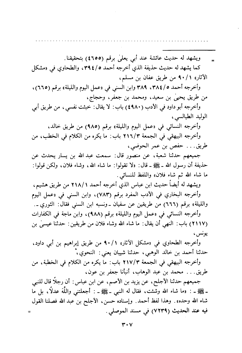 كما يشهد له حديث حذيفة الذي أخرجه أحمد 5/ 394، والطحاوي في "مشكل الآثار " 1/ 90 من طريق عفان بن مسلم، وأخرجه أحمد 5/ 384، 389 وابن السني في "عمل اليوم والليلة" برقم (665)، من طريق يحيى بن سعيد، ومحمد بن جعفر، وحجاج، وأخرجه أبو داود في الأدب (4980) باب: لا يقال: خبثت نفسي، من طريق أبي الوليد الطيالسي، وأخرجه النسائي في "عمل اليوم والليلة" برقم (985) من طريق خالد، وأخرجه البيهقي في الجمعة 3/ 216 باب: ما يكره من الكلام في الخطب، من طريق ... حفص بن عمر الحوضي، جميعهم حدثنا شعبة، عن منصور قال: سمعت عبد الله بن يسار يحدث عن حذيفة أن رسول الله -صلى الله عليه وسلم- قال: "لا تقولوا: ما شاء الله، وشاء فلان، ولكن قولوا: ما شاء الله ثم شاء فلان" واللفظ للنسائي.