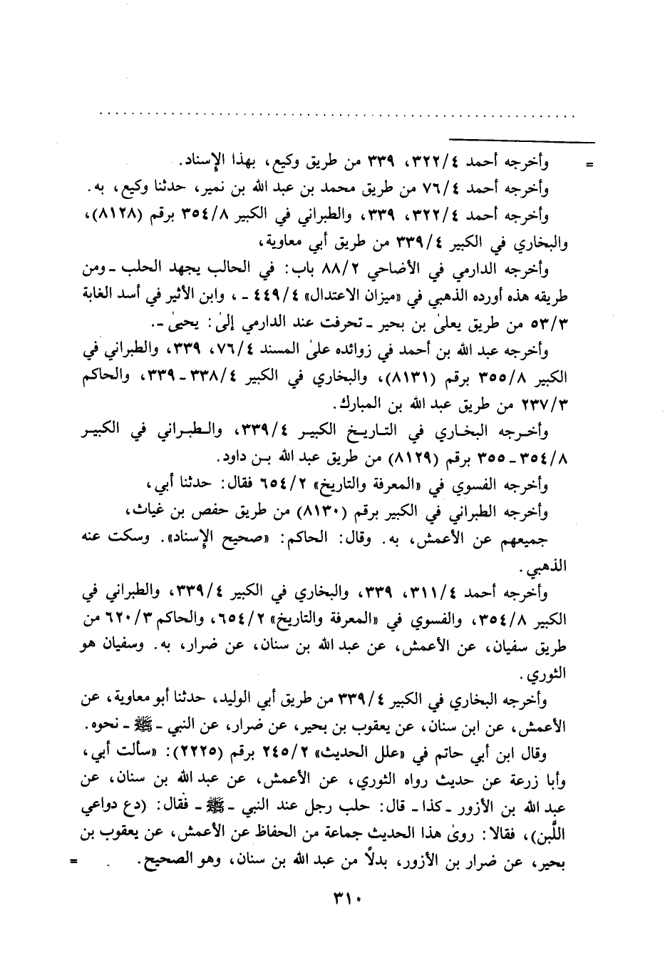 وقال ابن أبي حاتم في "علل الحديث" 2/ 245 برقم (2225): "سألت أبي، وأبا زرعة عن حديث رواه الثوري، عن الأعمش، عن عبد الله بن سنان، عن عبد الله بن الأزور- كذا- قال: حلب رجل عند النبي -صلى الله عليه وسلم-فقال: (دع دواعي اللبن)، فقالا: روى هذا الحديث جماعة من الحفاظ عن الأعمش، عن يعقوب بن بحير، عن ضرار بن الأزور، بدلا من عبد الله بن سنان، وهو الصحيح. =