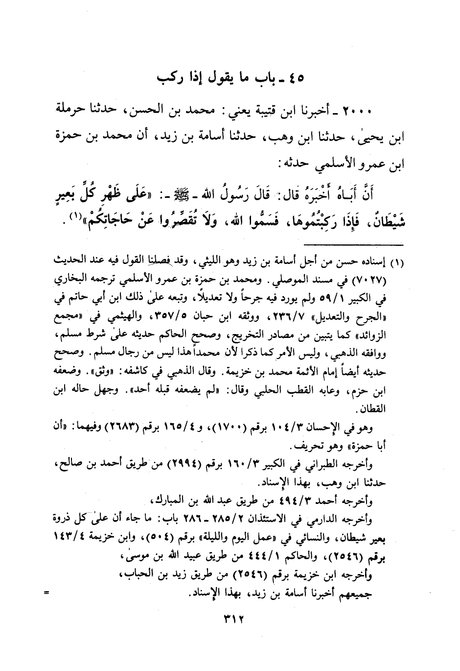 وأخرجه أحمد 3/ 494 من طريق عبد الله بن المبارك، وأخرجه الدارمي في الاستئذان 2/ 285 - 286 باب: ما جاء أن على كل ذروة بعير شيطان، والنسائي في "عمل اليوم والليلة" برقم (504)، وابن خزيمة 4/ 143 برقم (2546)، والحاكم 1/ 444 من طريق عبيد الله بن موسى، وأخرجه ابن خزيمة برقم (2546) من طريق زيد بن الحباب، جميعهم أخبرنا أسامة بن زيد، بهذا الإسناد. =