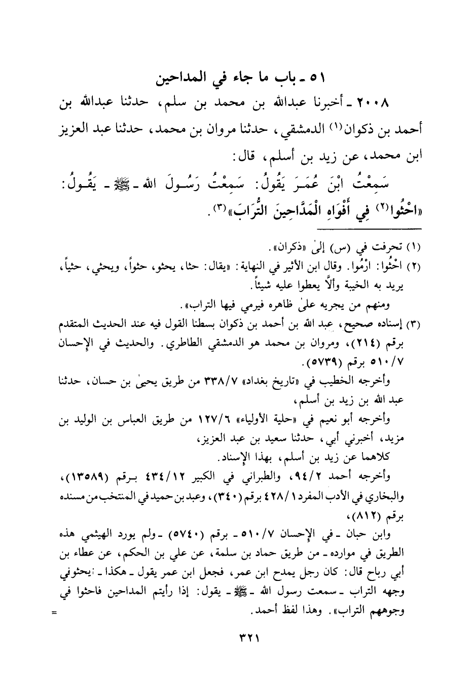 وأخرجه الخطيب في "تاريخ بغداد" 7/ 338 من طريق يحيى بن حسان، حدثنا عبد الله بن زيد بن أسلم، وأخرجه أبو نعيم في "حلية الأولياء" 6/ 127 من طريق العباس بن الوليد بن مزيد، أخبرني أبي، حدثنا سعيد بن عبد العزيز، كلاهما عن زيد بن أسلم، بهذا الإِسناد. وأخرجه أحمد 2/ 94، والطبراني في الكبير 12/ 434 برقم (13589)، والبخاري في الأدب المفرد 1/ 428 برقم (340)، وعبد بن حميد في المنتخب من مسنده برقم (812)، وابن حبان- في الإحسان 7/ 510 - برقم (5745) - ولم يورد الهيثمي هذه الطريق في موارده- من طريق حماد بن سلمة، عن علي بن الحكم، عن عطاء بن أبي رباح قال: كان رجل يمدح ابن عمر، فجعل ابن عمر يقول- هكذا- يحثو في وجهه التراب- سمعت رسول الله-صلى الله عليه وسلم- يقول: إذا رأيتم المداحين فاحثوا في وجوههم التراب". وهذا لفظ أحمد.