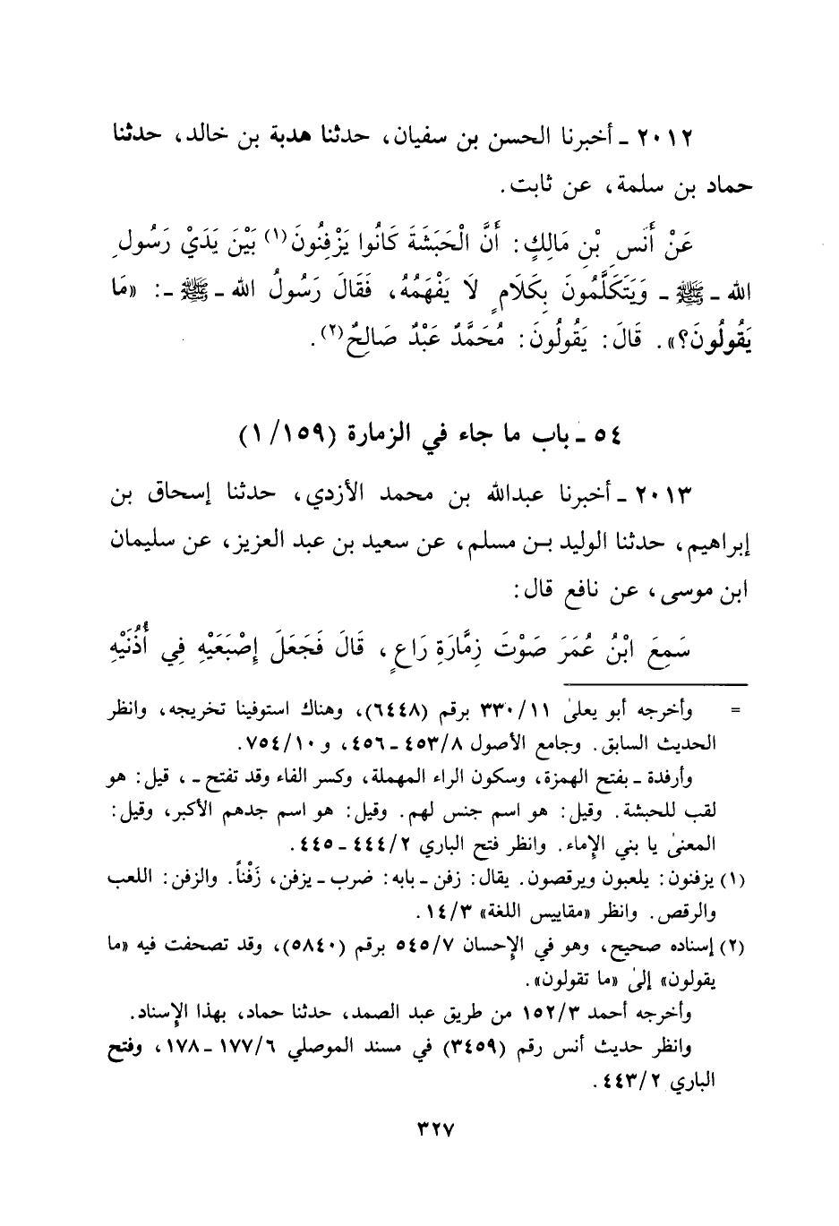 2012 - أخبرنا الحسن بن سفيان، حدثنا هدبة بن خالد، حدثنا حماد بن سلمة، عن ثابت. عَنْ أَنَسِ بْنِ مَالِكٍ: أنَّ الْحَبَشَةَ كَانُوا يَزْفِنُونَ (¬1) بَيْنَ يَدَيْ رَسُولِ الله-صلى الله عليه وسلم-وَيتَكَلَّمُونَ بِكَلاَمٍ لا يَفْهَمُهُ، فَقَالَ رَسُولُ الله-صلى الله عليه وسلم-: "مَا يَقُولُونَ؟ ". قَالَ: يَقُولُونَ: مُحَمَّدٌ عَبْدٌ صَالِحٌ (¬2).