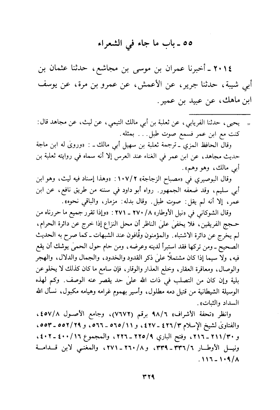 2014 - أخبرنا عمران بن موسى بن مجاشع، حدثنا عثمان بن أبي شيبة، حدثنا جرير، عن الأعمش، عن عمرو بن مرة، عن يوسف ماهك، عن عبيد بن عمير.