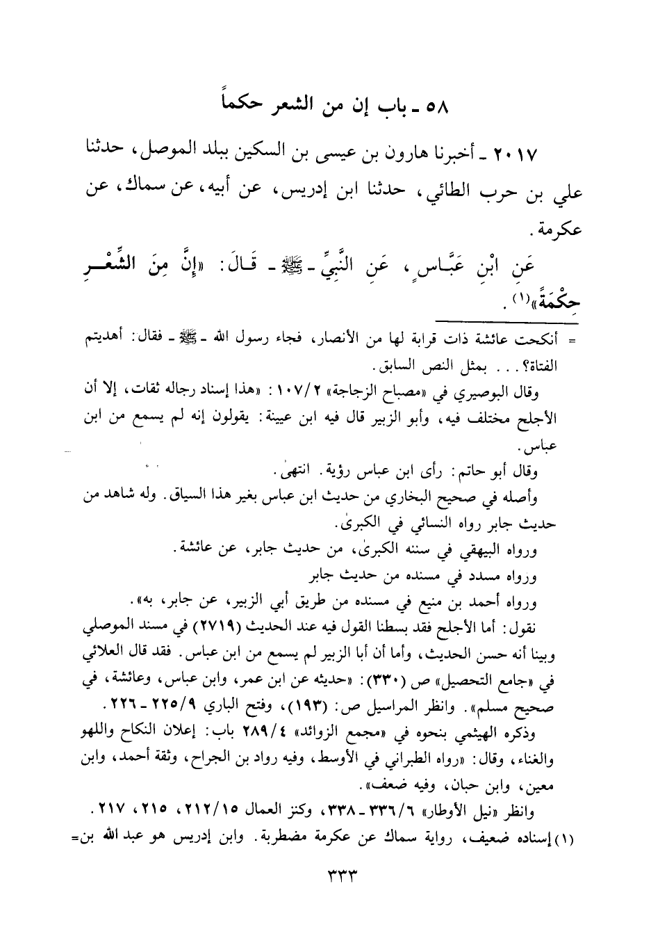 2017 - أخبرنا هارون بن عيسى بن السكين ببلد الموصل، حدثنا علي بن حرب الطائي، حدثنا ابن إدريس، عن أبيه، عن سماك، عن عكرمة.