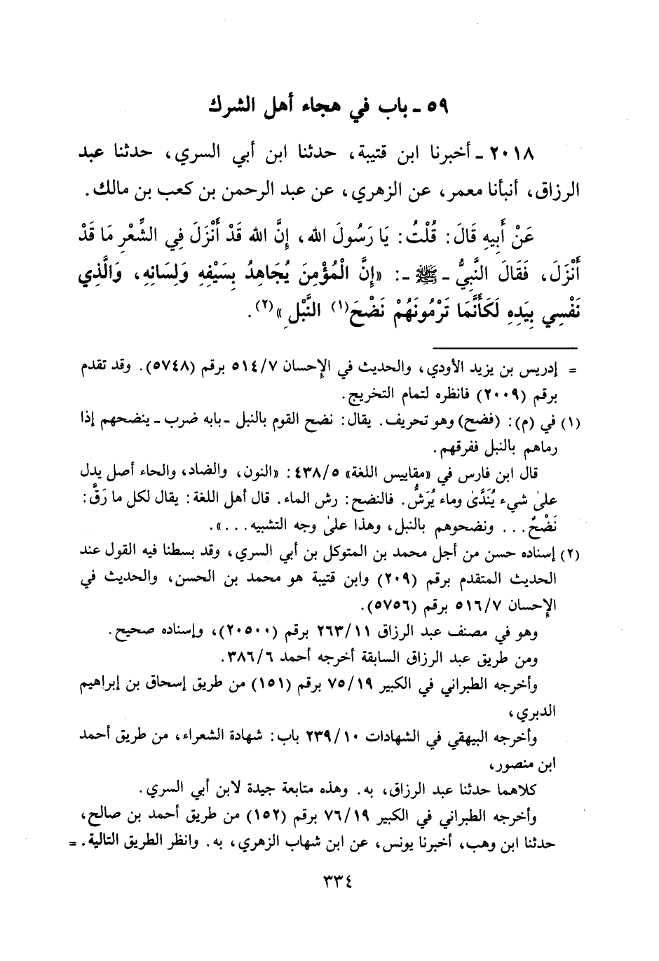 2018 - أخبرنا ابن قتيبة، حدثنا ابن أبي السري، حدثنا عبد الرزاق، أنبأنا معمر، عن الزهري، عن عبد الرحمن بن كعب بن مالك.