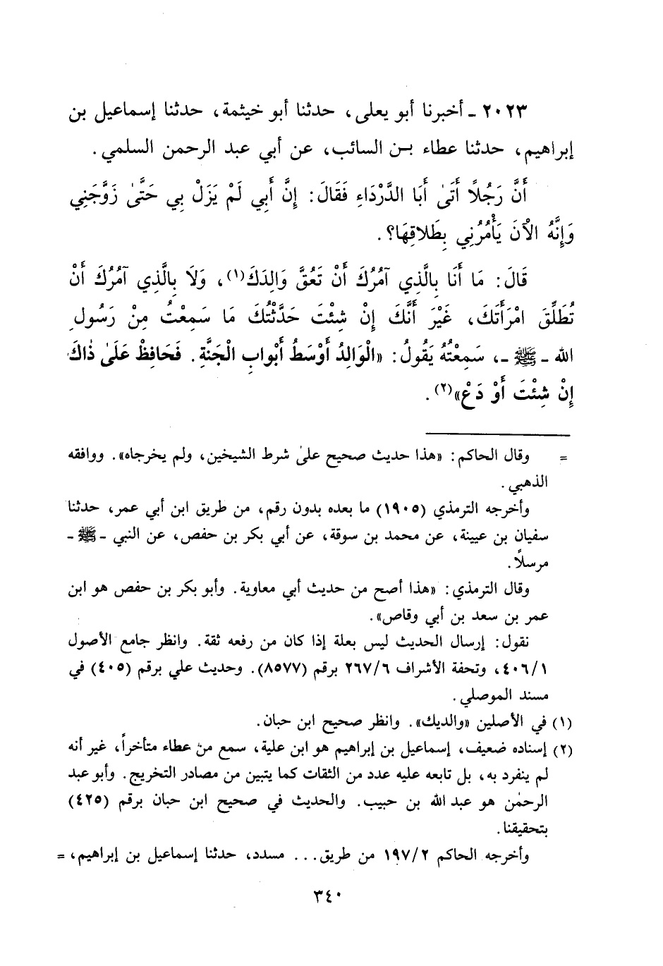2023 - أخبرنا أبو يعلى، حدثنا أبو خيثمة، حدثنا إسماعيل بن إبراهيم، حدثنا عطاء بن السائب، عن أبي عبد الرحمن السلمي.