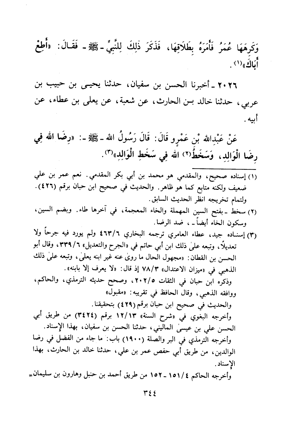 عَنْ عَبْدِ الله بْنِ عَمْرٍ وقَالَ: قَالَ رَسُولُ الله -صلى الله عليه وسلم-: "رِضَا الله فِي رِضَا الْوَالِدِ، وَسَخَطُ (¬2) الله فِي سَخَطِ الْوَالِدِ" (¬3).