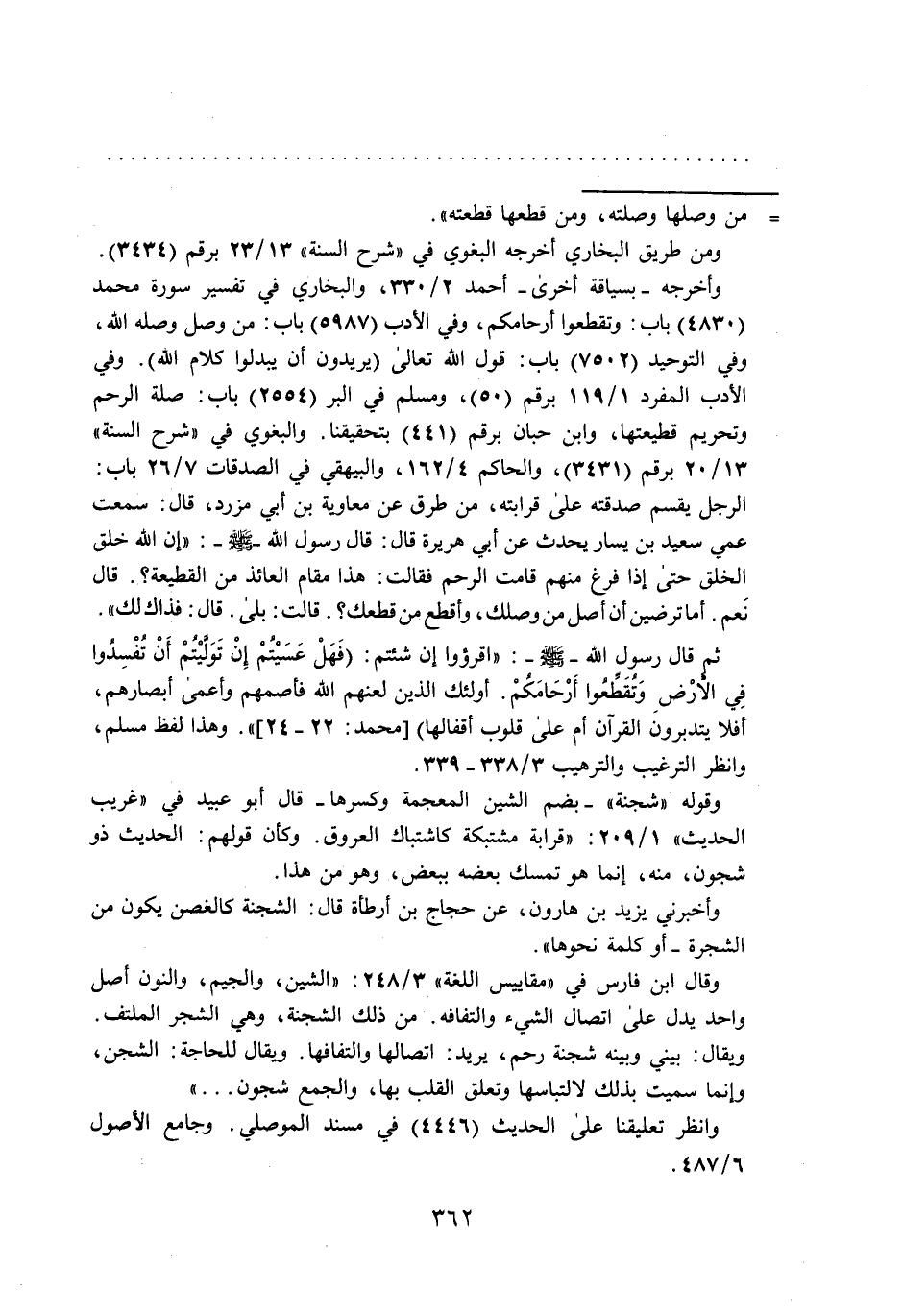 وقوله "شجنة "- بضم الشين المعجمة وكسرها- قال أبو عبيد في "غريب الحديث" 1/ 209: "قرابة مشتبكة كاشتباك العروق. وكان قولهم: الحديث ذو شجون، منه، إنما هو تمسك بعضه ببعض، وهو من هذا.