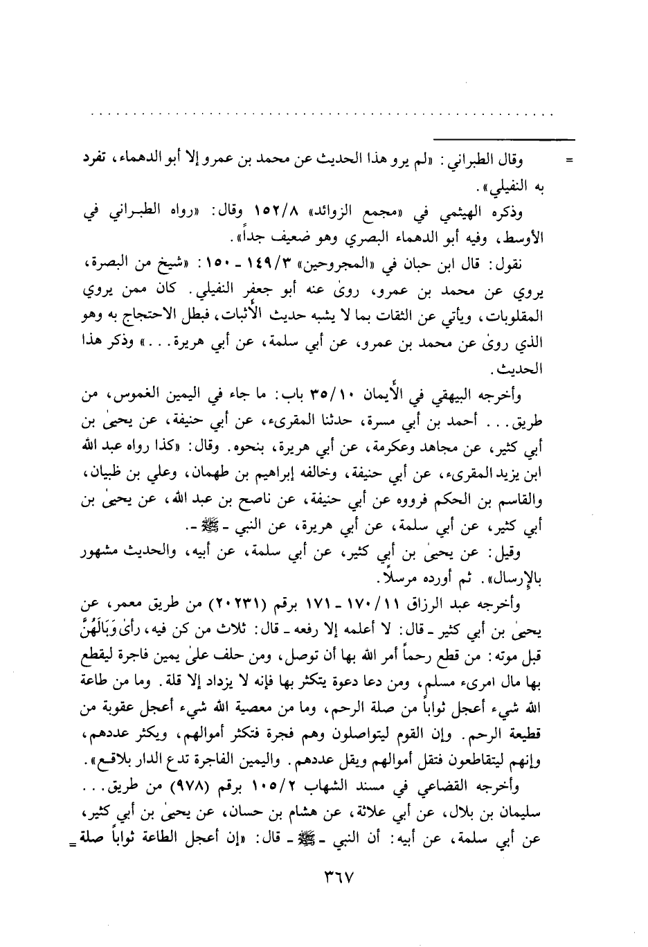 = وقال الطبراني: "لم يرو هذا الحديث عن محمد بن عمرو إلا أبو الدهماء، تفرد به النفيلي".