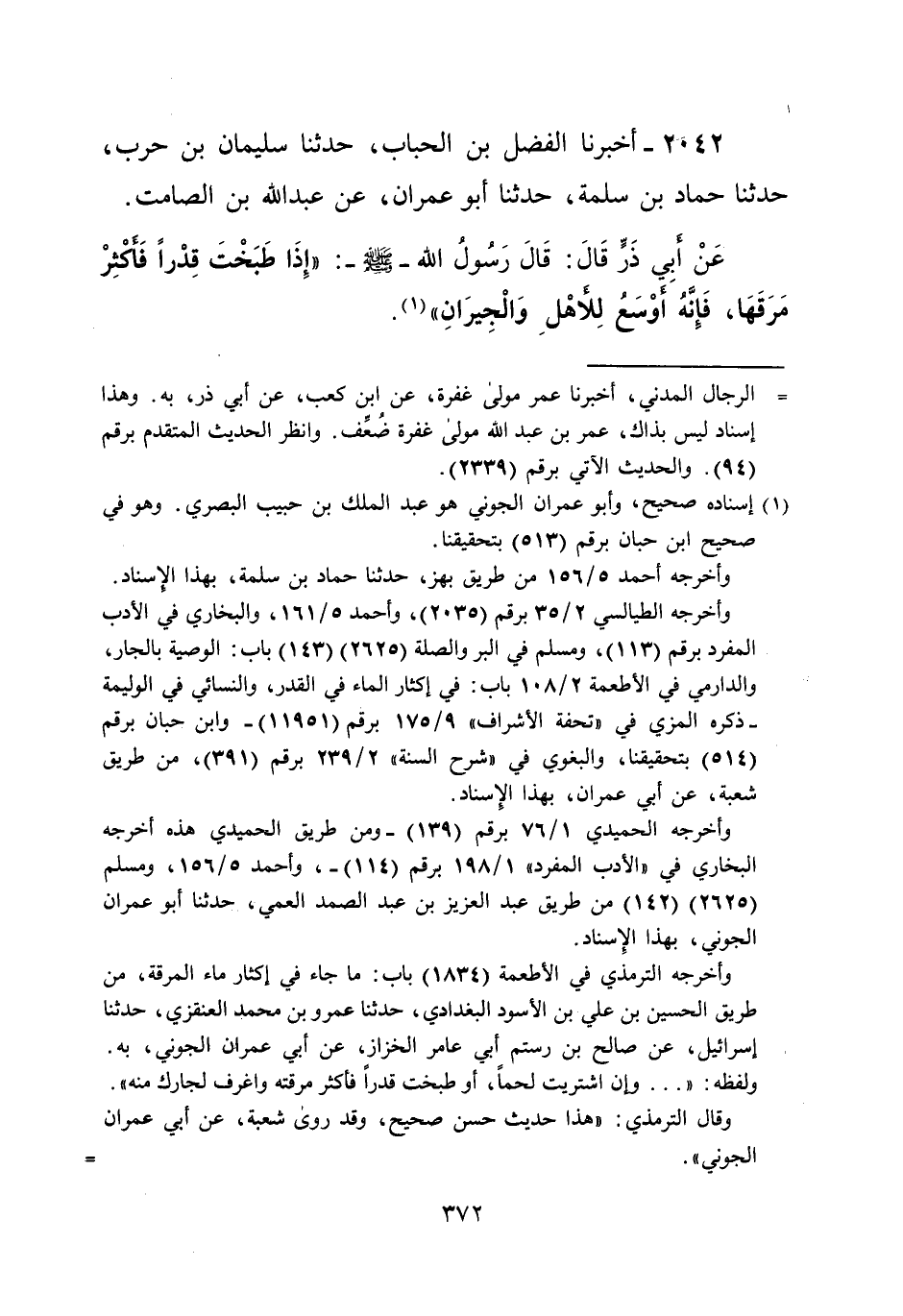 ولفظه: " ... وإن اشتريت لحماً، أو طبخت قدراً فأكثر مرقته واغرف لجارك منه". وقال الترمذي: "هذا حديث حسن صحيح، وقد روى شعبة، عن أبي عمران الجوني". =