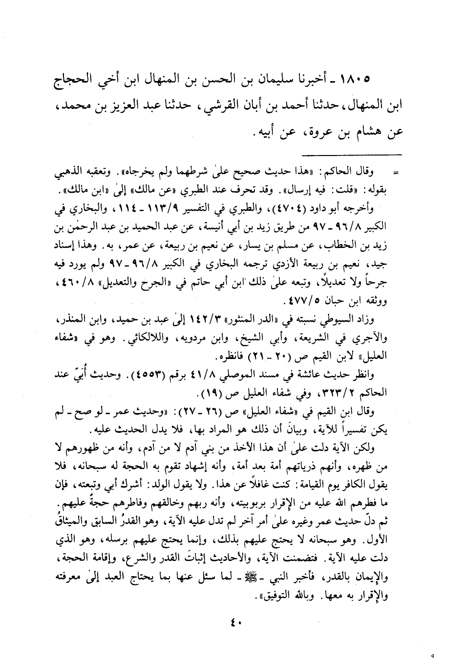 ثم دلّ حديث عمر وغيره على أمر آخر لم تدل عليه الآية، وهو القدرُ السابق والميثاقُ الأول. وهو سبحانه لا يحتج عليهم بذلك، وإنما يحتج عليهم برسله، وهو الذي دلت عليه الآية. فتضمنت الآية، والأحاديث إثباتَ القدر والشرع، وإقامة الحجة، والإِيمان بالقدر، فأخبر النبى-صلى الله عليه وسلم- لما سئل عنها بما يحتاج العبد إلى معرفته والإقرار به معها. وبالله التوفيق".
