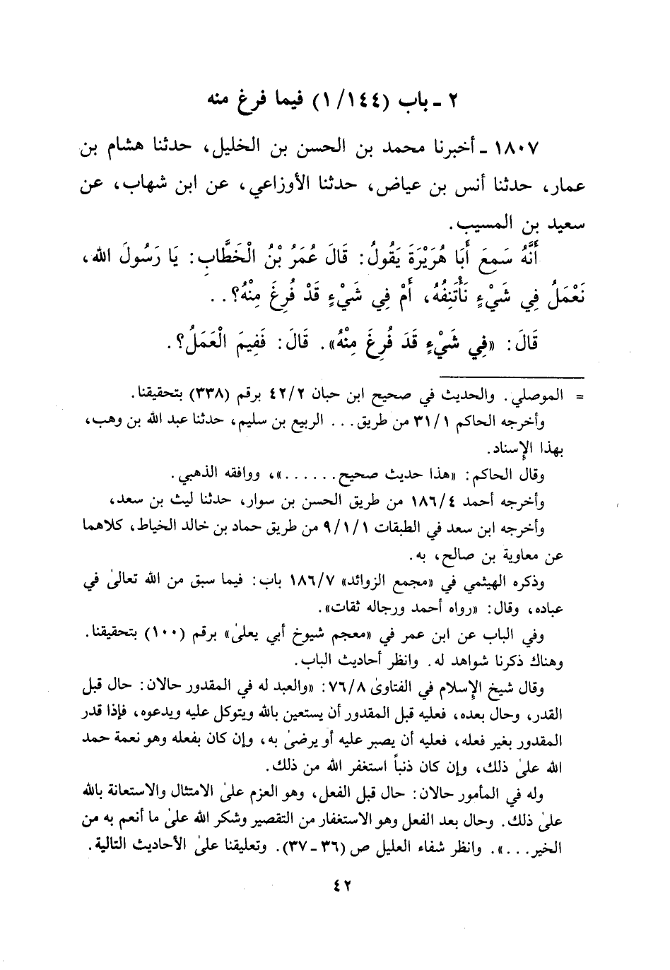 1807 - أخبرنا محمد بن الحسن بن الخليل، حدثنا هشام بن عمار، حدثنا أَنس بن عياض، حدثنا الأوزاعي، عن ابن شهاب، عن سعيد بن المسيب. أنَّهُ سَمعَ أَبَا هُرَيْرَةَ يَقُولُ: قَالَ عُمَرُ بْنُ الْخَطَّابِ: يَا رسول الله، نَعْمَلُ فِي شَيْءٍ نَأْتَنِفُهُ، أمْ فِي شَيْءٍ قَدْ فُرِغَ مِنْهُ؟ .. قَالَ: "فِي شيْءٍ قَدَ فُرِغَ مِنْهُ". قَالَ: فَفِيمَ الْعَمَلُ؟.