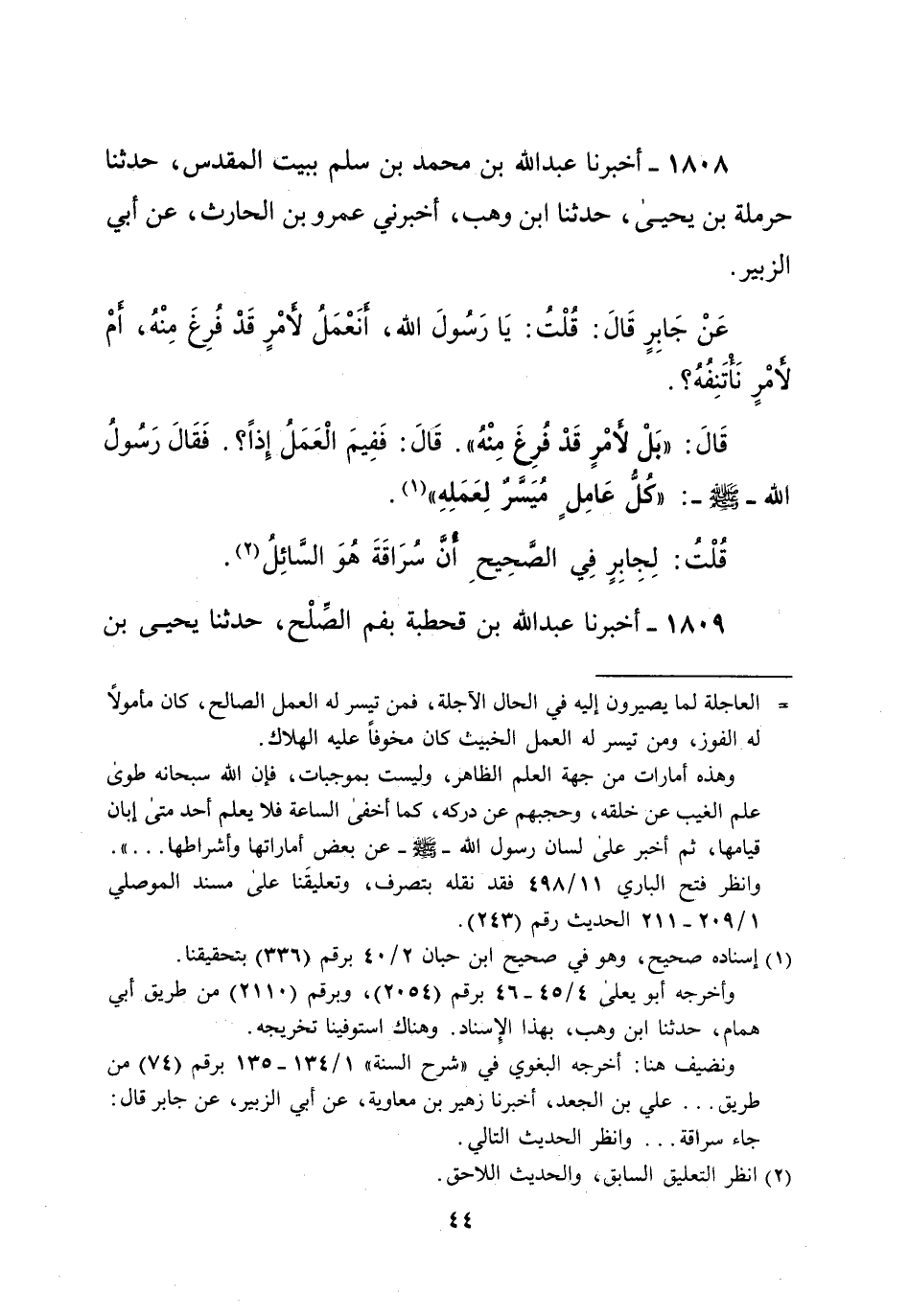 1808 - أخبرنا عبد الله بن محمد بن سلم ببيت المقدس، حدثنا حرملة بن يحيى، حدثنا ابن وهب، أخبرني عمرو بن الحارث، عن أبي الزبير. عَنْ جَابِرٍ قَالَ: قُلْتُ: يَا رسول الله، أنَعْمَلُ لأمْرٍ قَدْ فُرِغَ مِنْهُ، أمْ لأمْرٍ نَأْتَنِفُهُ؟. قَالَ: "بَلْ لأمْرٍ قَدْ فُرِغَ مِنْهُ". قَالَ: فَفِيمَ الْعَمَلُ إِذاً؟. فَقَالَ رَسُولُ الله -صلى الله عليه وسلم-: "كُلُّ عَامِلٍ مُيَسَّرٌ لِعَمَلِهِ" (¬1). قُلْتُ: لِجِابِرٍ فِي الصّحِيحِ أُنَّ سُرَاقَةَ هُوَ السَّائِلُ (¬2).