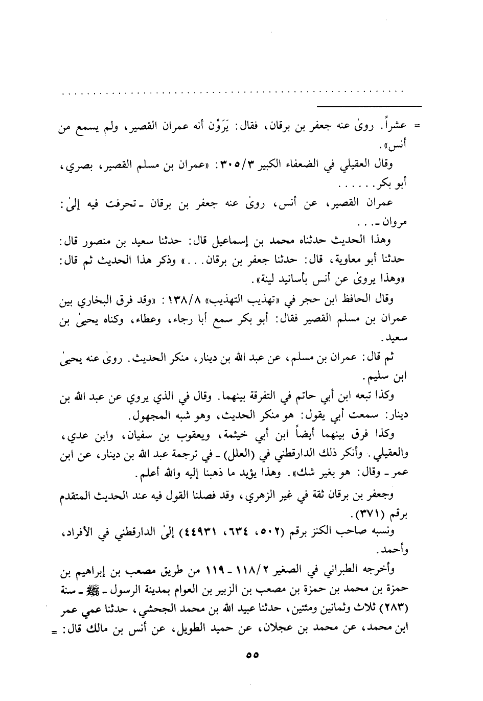 = عشراً. روى عنه جعفر بن برقان، فقال: يَرَوْن أنه عمران القصير، ولم يسمع من أَنس". وقال العقيلي في الضعفاء الكبير 3/ 305: "عمران بن مسلم القصير، بصري، أبو بكر ...... عمران القصير، عن أَنس، روى عنه جعفر بن برقان- تحرفت فيه إلى: مروان- ... وهذا الحديث حدثناه محمد بن إسماعيل قال: حدثنا سعيد بن منصور قال: حدثنا أبو معاوية، قال: حدثنا جعفر بن برقان ... " وذكر هذا الحديث ثم قال: "وهذا يروى عن أَنس بأسانيد لينة".