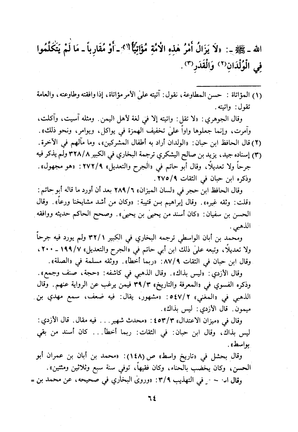 الله -صلى الله عليه وسلم-: "لاَ يَزَال أَمْرُ هذِهِ الأمَّة مؤَاتَياً (¬1) - "أوْ مُقَارِباً- مَا لَمْ يَتَكَّلمُوا فى الْوُلْدَانِ (¬2) وَالْقَدَرِ (¬3).