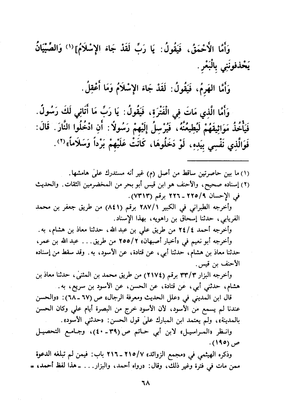 وَأمَّا الأحْمَقُ، فَيَقُولُ: يَا رَبِّ لَقَدْ جَاءَ الإِسْلامُ، (¬1) وَالصِّبْيَانُ يَخذفونَنِي بِالْبَعْرِ. وَأمَّا الهَرِمُ، فَيَقُولُ: لَقَدْ جَاءَ الإِسلامُ وَمَا أعْقِلُ. وَأمَّا الَّذِي مَاتَ فِي الْفَتْرَةِ، فَيَقُولُ: يَا رَبِّ مَا أتَانِي لَكَ رَسُولٌ. فَيَأْخُذُ مَوَاثِيقَهُمْ لَيُطِيعُنَّهُ، فَيُرْسِلُ إِلَيْهِمْ رَسُولاً: أنِ ادْخُلُوا النَّارَ. قَالَ: فَوَالَّذِي نَفْسِي بِيَدِهِ، لَوْ دَخَلُوهَا، كَانَتْ عَلَيْهِمْ بَرْداً وَسَلاماً" (¬2).