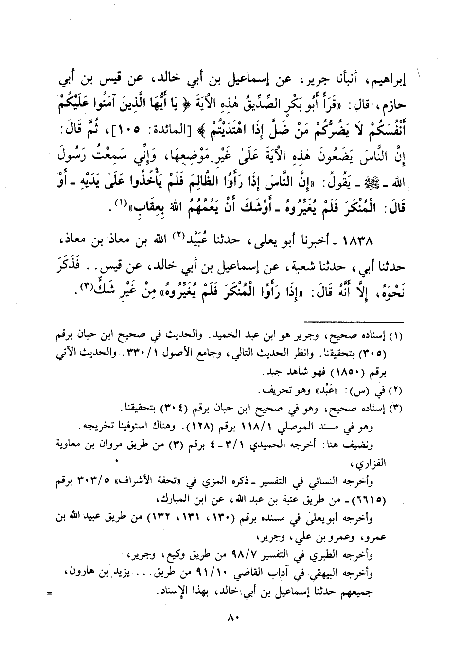 1838 - أخبرنا أبو يعلى، حدثنا عُبَيْد (¬2) الله بن معاذ بن معاذ، حدثنا أبي، حدثنا شعبة، عن إسماعيل بن أبي خالد، عن قيس .. فَذَكَرَ نَحْوَهُ، إِلاَّ أنَّهُ قَالَ: "إِذَا رَأوُا الْمُنْكَرَ فَلَمْ يُغَيِّرُوهُ" مِنْ غَيْرِ شَكٍّ (¬3).