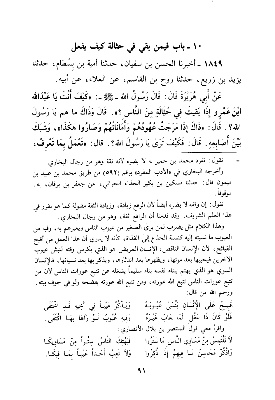 1849 - أخبرنا الحسن بن سفيان، حدثنا أمية بن بِسْطام، حدثنا يزيد بن زريع، حدثنا روح بن القاسم، عن العلاء، عن أبيه. عَنْ أَبِي هُرَيْرَةَ قَالَ: قَالَ رَسُولُ الله -صلى الله عليه وسلم-: "كَيْفَ أَنْتَ يَا عَبْدَ الله ابْنَ عَمْرٍ وإِذَا بَقيتَ فِي حُثَاِلَة مِنَ النَّاسِ؟ ". قَالَ وَذاكَ ما هم يَا رَسُولَ الله؟. قَالَ: "ذَاكَ إِذَا مَرَجَتْ عُهُودُهُمْ وَأمَانَاتُهُمْ وَصَارُوا هكَذَا"، وَشبَكَ بَيْنَ أَصَابِعِهِ. قَالَ: فَكَيْفَ تَرَى يَا رسول الله؟. قال: "تَعْمَلُ بِمَا تَعْرِفُ،
