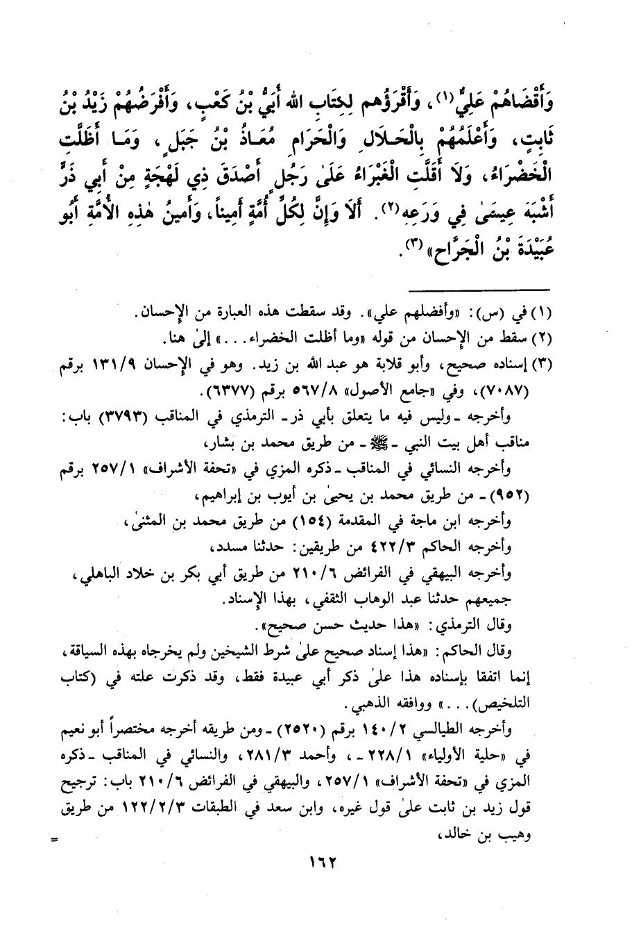 وَأقْضَاهُمْ عَلِيٌّ (¬1)، وَأقْرَؤُهم لِكِتَاب الله أُبىُّ بْنُ كعْبٍ، وَأفْرَضُهُمْ زَيْدُ بْنُ ثَابِتٍ، وَأعْلَمُهُمْ بِالْحَلاَلِ وَالْحَرَامِ مُعَاذُ بْنُ جَبَلٍ، وَمَا أظَلَّتِ الْخَضْرَاءُ، وَلا أَقَلَّتِ الْغَبْرَاءُ عَلَى رَجُلٍ أصْدَقَ ذِي لَهْجَةٍ مِنْ أبِي ذرٍّ أشْبَهَ عيسى فِي وَرَعِه (¬2) أَلاَ وَإِنَّ لِكُل أمَّةٍ أَمِيناً، وَأمينُ هذِهِ الأمَّةِ أبُو عُبَيْدَةَ بْنُ الْجَرَّاح" (¬3).