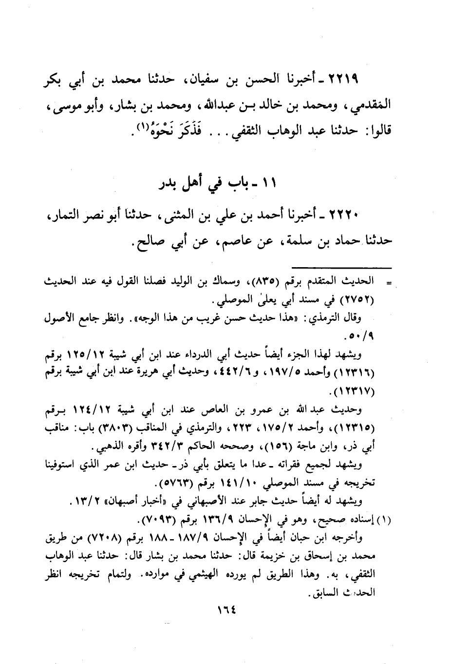2219 - أخبرنا الحسن بن سفيان، حدثنا محمد بن أبي بكر المقدمي، ومحمد بن خالد بن عبد الله، ومحمد بن بشار، وأبو موسى، قالوا: حدثنا عبد الوهاب الثقفي ... فَذَكَرَ نَحْوَهُ (¬1).