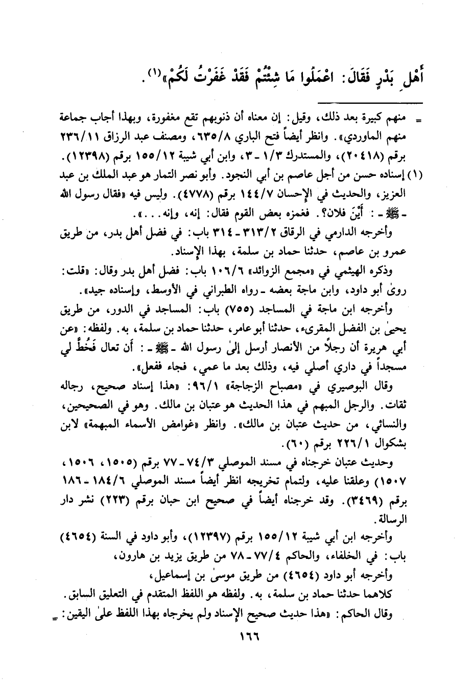 = منهم كبيرة بعد ذلك، وقيل: إن معناه أن ذنوبهم تقع مغفورة، وبهدا أجاب جماعة منهم الماوردي". وانظر أيضاً فتح الباري 8/ 635، ومصنف عبد الرزاق 11/ 236 برقم (20418)، والمستدرك 3/ 1 - 3، وابن أبي شيبة 12/ 155 برقم (12398).