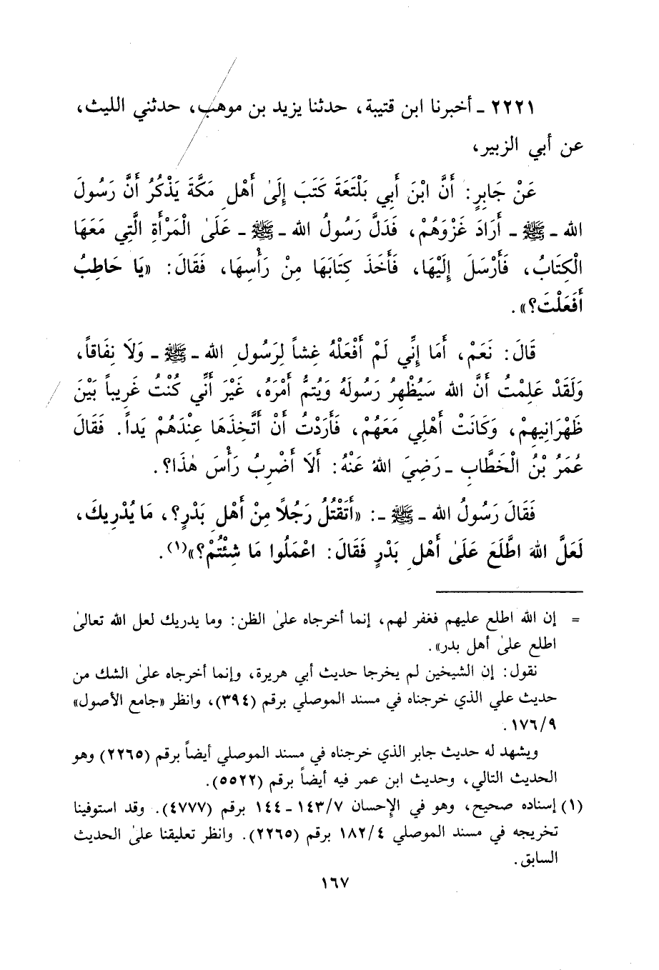 عَنْ جَابِرٍ: أنَّ ابْنَ أَبِي بَلْتَعَةَ كَتَبَ إِلَى أَهل مَكَّةَ يَذْكُرُ أنَّ رَسُولَ الله -صلى الله عليه وسلم- أَرَادَ غَزْوَهُمْ، فَدَلَّ رَسُولُ الله -صلى الله عليه وسلم- عَلَى الْمَرأَةِ الَّتِي مَعَهَا الْكِتَابُ، فَأَرْسَلَ إِلَيْهَا، فَأَخَذَ كِتَابَهَا مِنْ رَأْسِهَا، فَقَالَ: "يَا حَاطِبُ أفَعَلْتَ؟ ". قَالَ: نَعَمْ، أما إِنِّي لَمْ أَفْعَلْهُ غِشاً لِرَسُولِ الله -صلى الله عليه وسلم- وَلا نِفَاقاً، وَلَقَدْ عَلِمْتُ أنَّ الله سَيُظْهِرُ رَسُولَهُ وُيتمُّ أَمْرَهُ، غَيْرَ أنِّي كُنْتُ غَرِيباً بَيْنَ ظَهْرَانِيهِمْ، وَكَانَتْ أَهْلِي مَعَهُمْ، فَأَرَدْتُ أنْ أَتَّخِذَهَا عِنْدَهُمْ يَداً. فَقَالَ عُمَرُ بْنُ الْخَطَّابِ -رَضِيَ اللهُ عَنْهُ: ألاَ أَضْرِبُ رَأْسَ هذَا؟. فَقَالَ رَسُولُ الله -صلى الله عليه وسلم-: "أتَقْتُلُ رَجُلاً مِنْ أَهْلِ بَدْرٍ؟، مَا يُدْرِيكَ، لَعَلَّ اللهَ اطَّلَعَ عَلَى أَهْلِ بَدْرٍ فَقَالَ: اعْمَلُوا مَا شِئْتُمْ؟ " (¬1).
