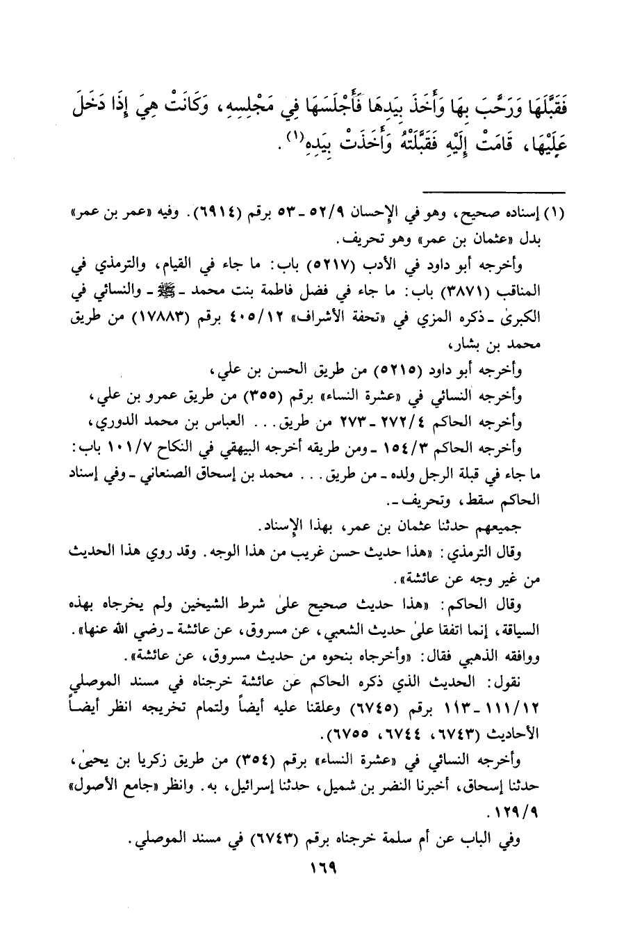 وأخرجه أبو داود في الأدب (5217) باب: ما جاء في القيام، والترمذي في المناقب (3871) باب: ما جاء في فضل فاطمة بنت محمد- صلى الله عليه وسلم- والنسائي في الكبرى- ذكره المزي في "تحفة الأشراف" 12/ 405 برقم (17883) من طريق محمد بن بشار، وأخرجه أبو داود (5215) من طريق الحسن بن علي، وأخرجه النسائي في "عشرة النساء" برقم (355) من طريق عمرو بن علي، وأخرجه الحاكم 4/ 272 - 273 من طريق ... العباس بن محمد الدوري، وأخرجه الحاكم 3/ 154 - ومن طريقه أخرجه البيهقي في النكاح 7/ 101 باب: ما جاء في قبلة الرجل ولده- من طريق ... محمد بن إسحاق الصنعاني- وفي إسناد الحاكم سقط، وتحريف-.