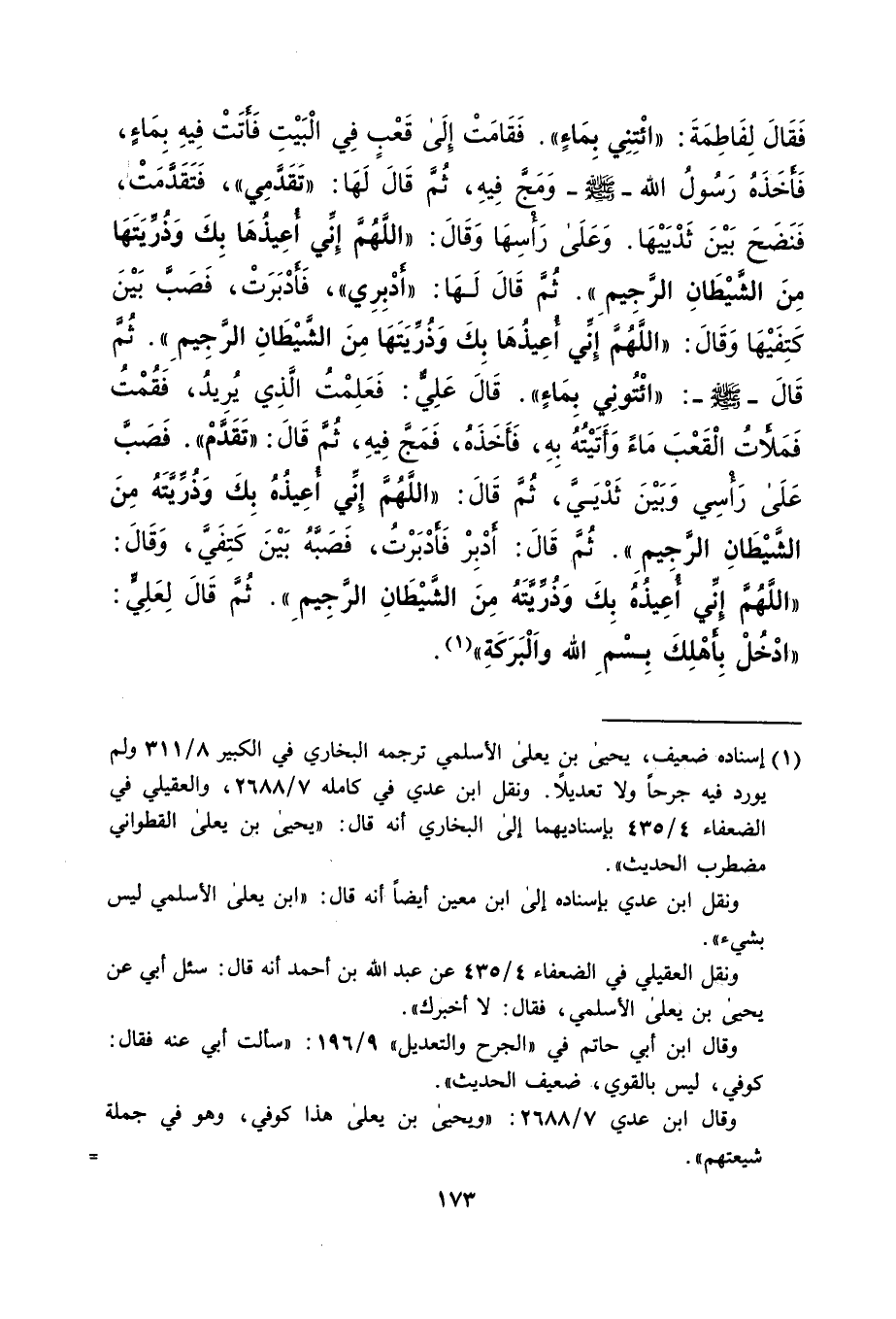 فَقَالَ لِفَاطِمَةَ: "ائْتِنِي بِمَاءٍ". فَقَامَتْ إِلَى قَعْبٍ فِي الْبَيْتِ فَأتَتْ فِيهِ بِمَاءٍ، فَأخَذَهُ رَسُولُ الله -صلى الله عليه وسلم- وَمَجَّ فِيهِ، ثُمّ قَال لَهَا: "تقدَّمِي"،فَتَقَدَّمَتْ، فَنَضَحَ بَيْنَ ثَدْيَيْهَا. وَعَلَى رَأَسِهَا وَقَالَ: "اللَّهُمَّ إِنِّي أُعِيذُهَا بِكَ وَذُريَتَهَا مِنَ الشَّيْطَانِ الرَّجِيمِ". ثُمَّ قَالَ لَهَا: "أدْبِرِي"، فَأدْبَرَتْ، فَصَبَّ بَيْنَ كَتِفَيْهَا وَقَالَ: "اللهم إِني أعِيذُهَا بِكَ وَذُرِّيَتَهَا مِنَ الشَّيْطَانِ الرَّجِيمِ". ثُمَّ قَالَ -صلى الله عليه وسلم-: "ائْتُونِي بِمَاءٍ". قَالَ عَلِي: فَعَلِمْتُ الّذِي يُريدُ، فَقُمْتُ فَمَلأتُ الْقَعْبَ مَاءً وَأَتَيْتُهُ بِهِ، فَأخَذَهُ، فَمَجَّ فِيهِ، ثُمَّ قَالَ: "تَقَدَّمْ". فَصَبَّ عَلَى رَأَسِي وَبَيْنَ ثَدْيَيَّ، ثُمّ قَالَ: "اللَّهُمَّ إنِّي أعِيذُهُ بِكَ وَذُرِّيَّتَهُ مِنَ الشَّيْطَانِ الرَّجِيمِ". ثُمّ قَالَ: أدْبِرْ فَأدْبَرْتُ، فَصَبَّهُ بَيْنَ كَتِفَيَّ، وَقَالَ: "اللهُمَّ إنِّي أعِيذُهُ بِكَ وَذُرِّيَّتَهُ مِنَ الشَّيْطَانِ الرَّجِيمِ". ثُمّ قَالَ لِعَلِيٍّ: "ادْخُلْ بِأهْلِكَ بِسْمِ الله واَلْبَرَكَةِ" (¬1).