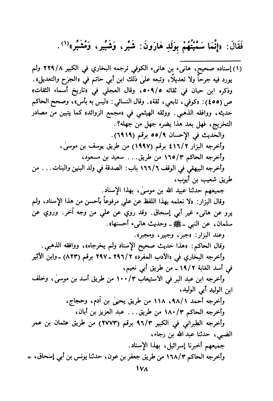 فَقَالَ: "إنَّمَا سَمَّيْتُهُمْ بِوَلَدِ هارَونَ: شَبَّر، وَشَبِّير، وَمُشَبِّر" (¬1).