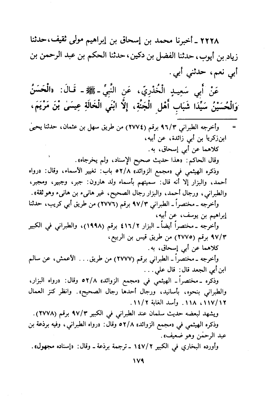 2228 - أخبرنا محمد بن إسحاق بن إبراهيم مولى ثقيف، حدثنا زياد بن أيوب، حدثنا الفضل بن دكين، حدثنا الحكم بن عبد الرحمن بن أبي نعم، حدثني أبي.