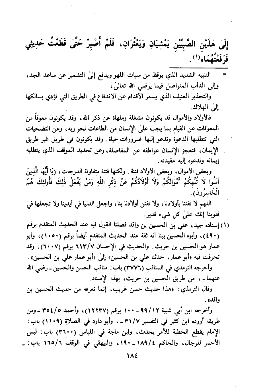 = التنبيه الشديد الذي يوقظ من سبات اللهو ويدفع إلى التشمير عن ساعد الجد، وإلى الدأب المتواصل فيما يرضي الله تعالى، والتحذير العنيف الذي يسمر الأقدام عن الاندفاع في الطريق التي تؤدي بسالكها إلى الهلاك. فالأولاد والأموال قد يكونون مشغلة وملهاة عن ذكر الله، وقد يكونون معوقاً من المعوقات عن القيام بما يجب على الإنسان من الطاعات نحو ربه، وعن التضحيات التي تتطلبها الدعوة وندعو إليها ضرورات حياة. وقد يكونون في طريق غير طريق الإيمان، فتعجز الإنسان عواطفه عن المفاصلة، وعن تحديد الموقف الذي يتطلبه إيمانه وتدعوه إليه عقيدته. وبعض الأموال، وبعض الأولاد فتنة. ولكنها فتنة متفاوتة الدرجات، {يَا أَيُّهَا الَّذِينَ آمَنُوا لَا تُلْهِكُمْ أَمْوَالُكُمْ وَلَا أَوْلَادُكُمْ عَنْ ذِكْرِ اللَّهِ وَمَنْ يَفْعَلْ ذَلِكَ فَأُولَئِكَ هُمُ الْخَاسِرُونَ}. اللهم لا تفتنا بأولادنا، ولا تفتن أولادنا بنا، واجعل الدنيا في أيدينا ولا تجعلها في قلوبنا إنك على كل شيء قدير.